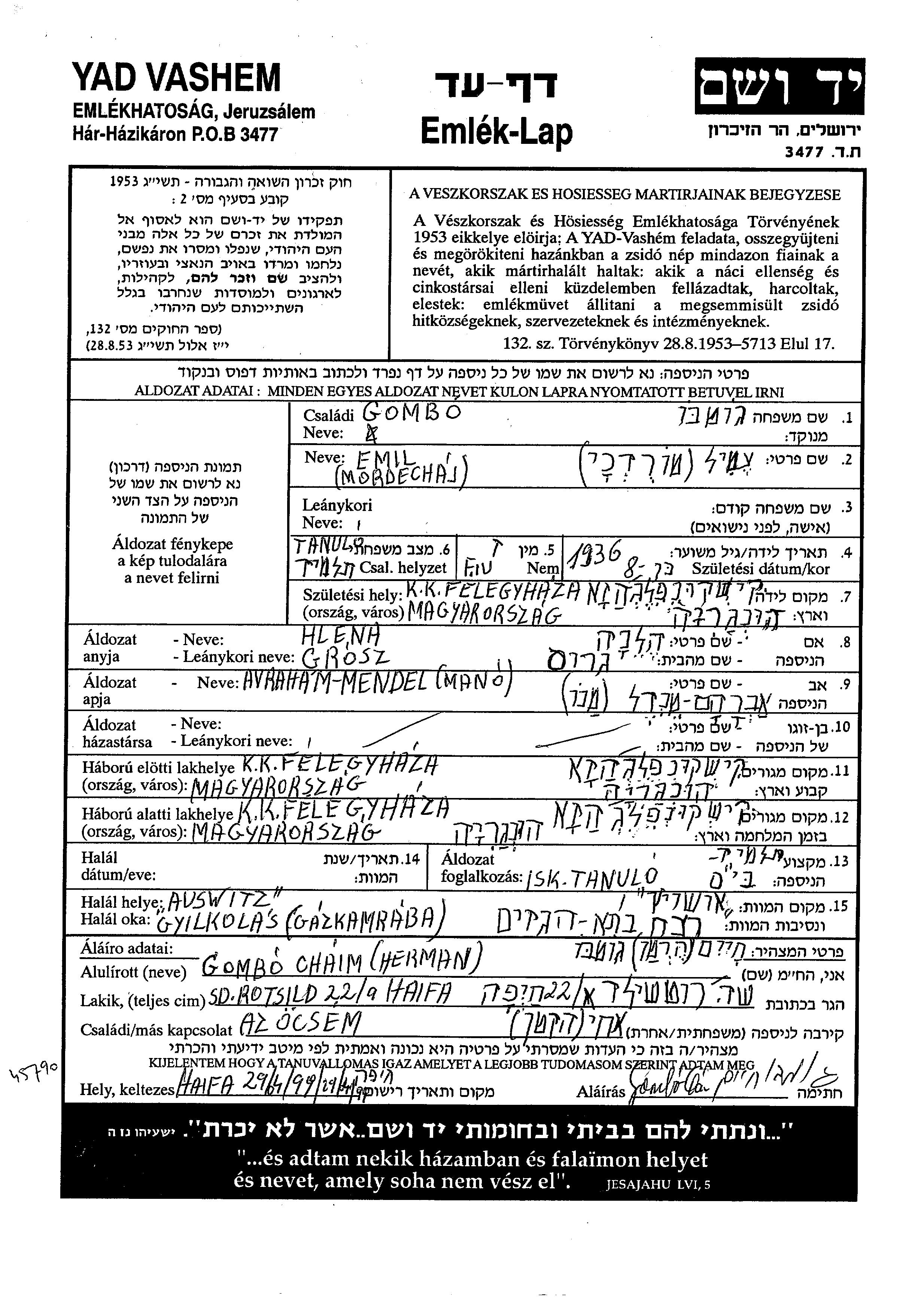 Gombo | Mordechaj Emil | 1936 | Felegyhaza, Ungarn | Gedenkblatt |