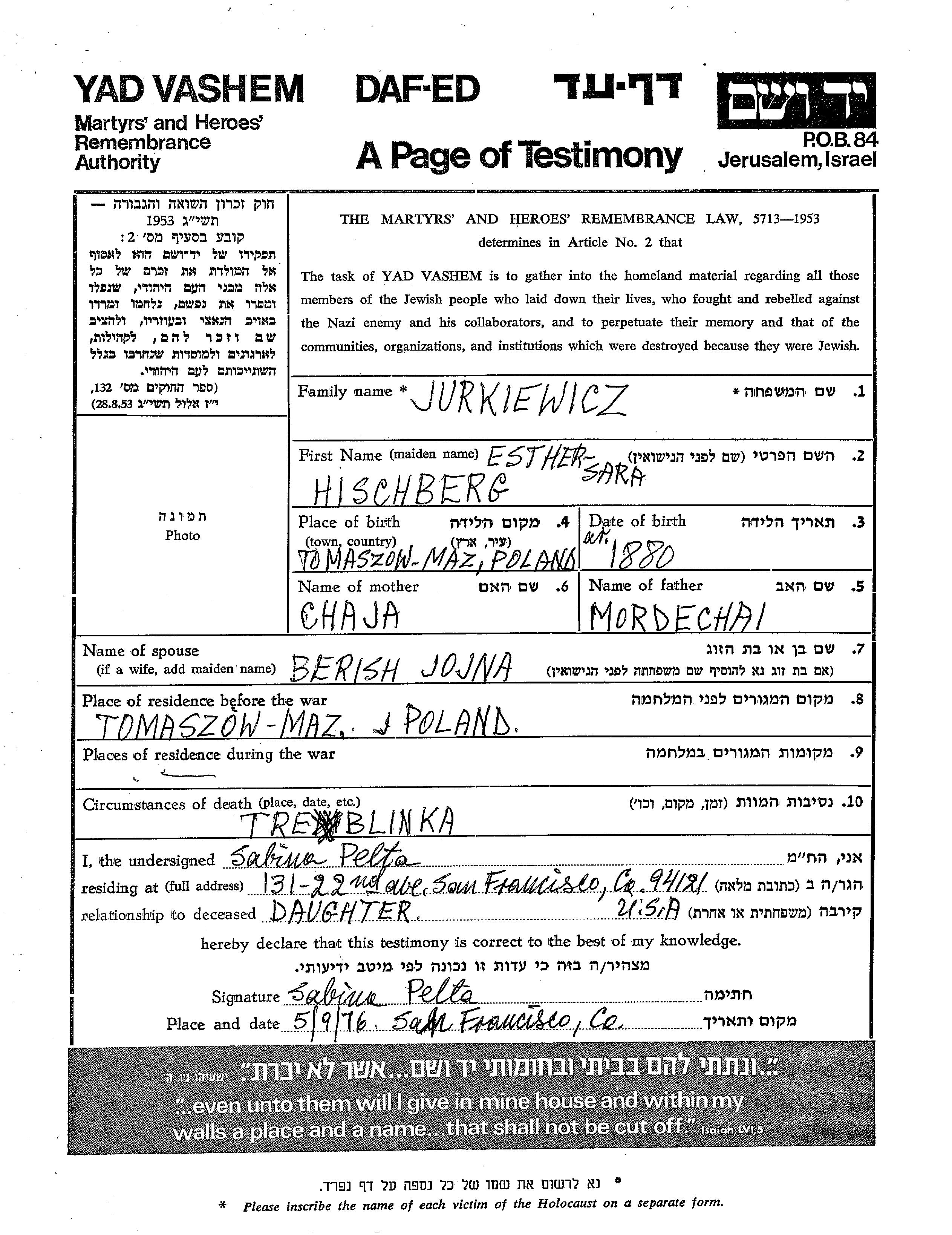 Esther Sara Jurkiewicz, geb. Hischberg wurde im Jahr 1880 in Tomaszow Mazowieckie, Polen geboren. Vor dem Zweiten Weltkrieg lebte sie in Tomaszow Mazowieckie, Polen.