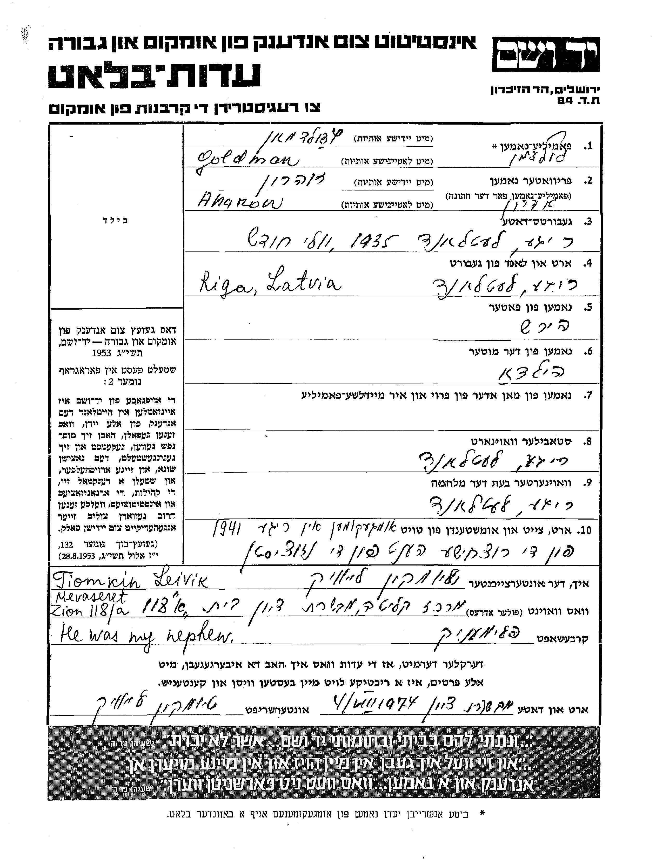 Aharon Goldman wurde im Jahr 1935 in Riga, Lettland geboren. Vor dem Zweiten Weltkrieg lebte er in Riga, Lettland.