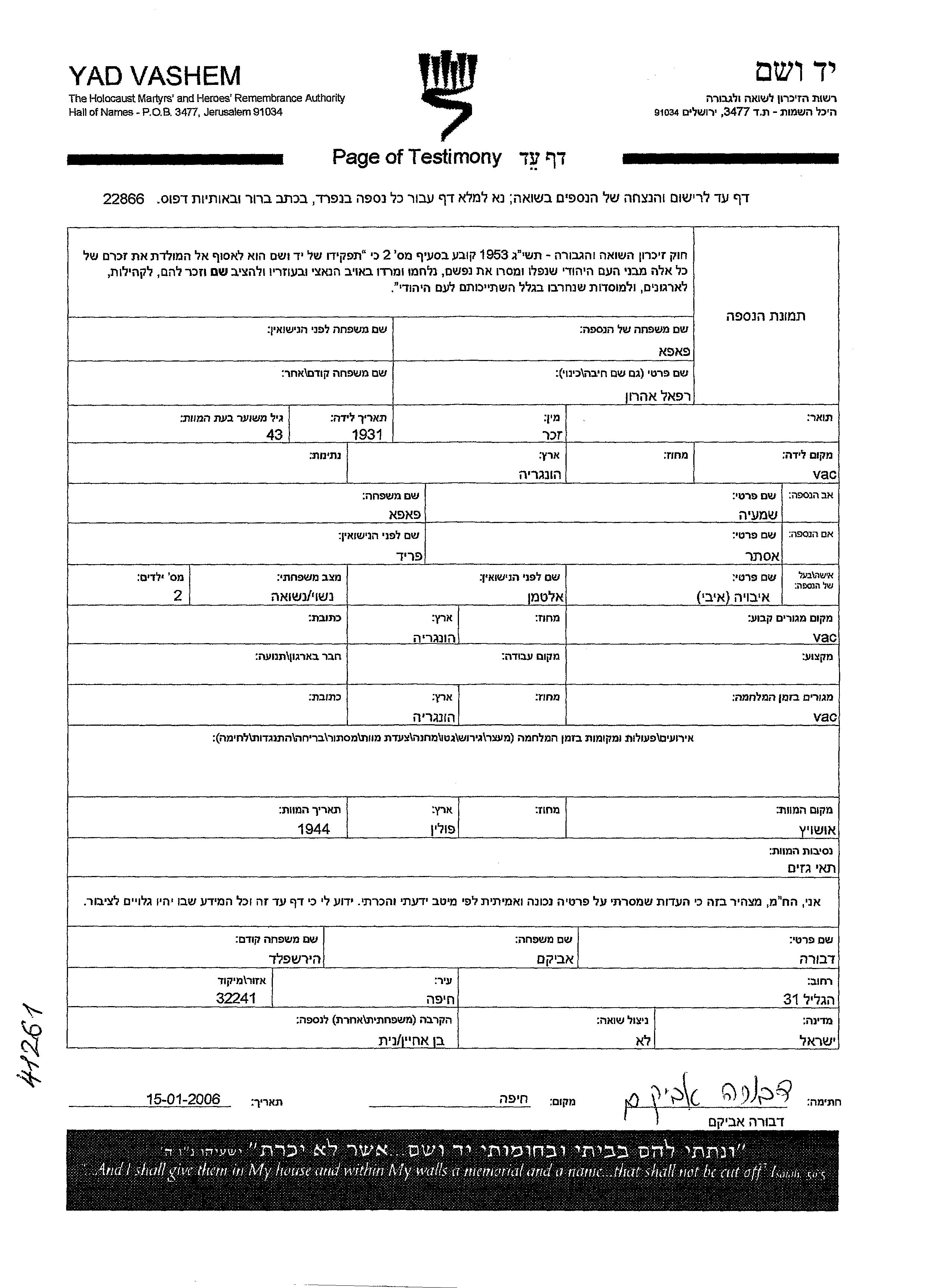 Rafael Aharon wurde in der Schoah ermordet. Todesort: Auschwitz, Polen im Jahr 1944.
