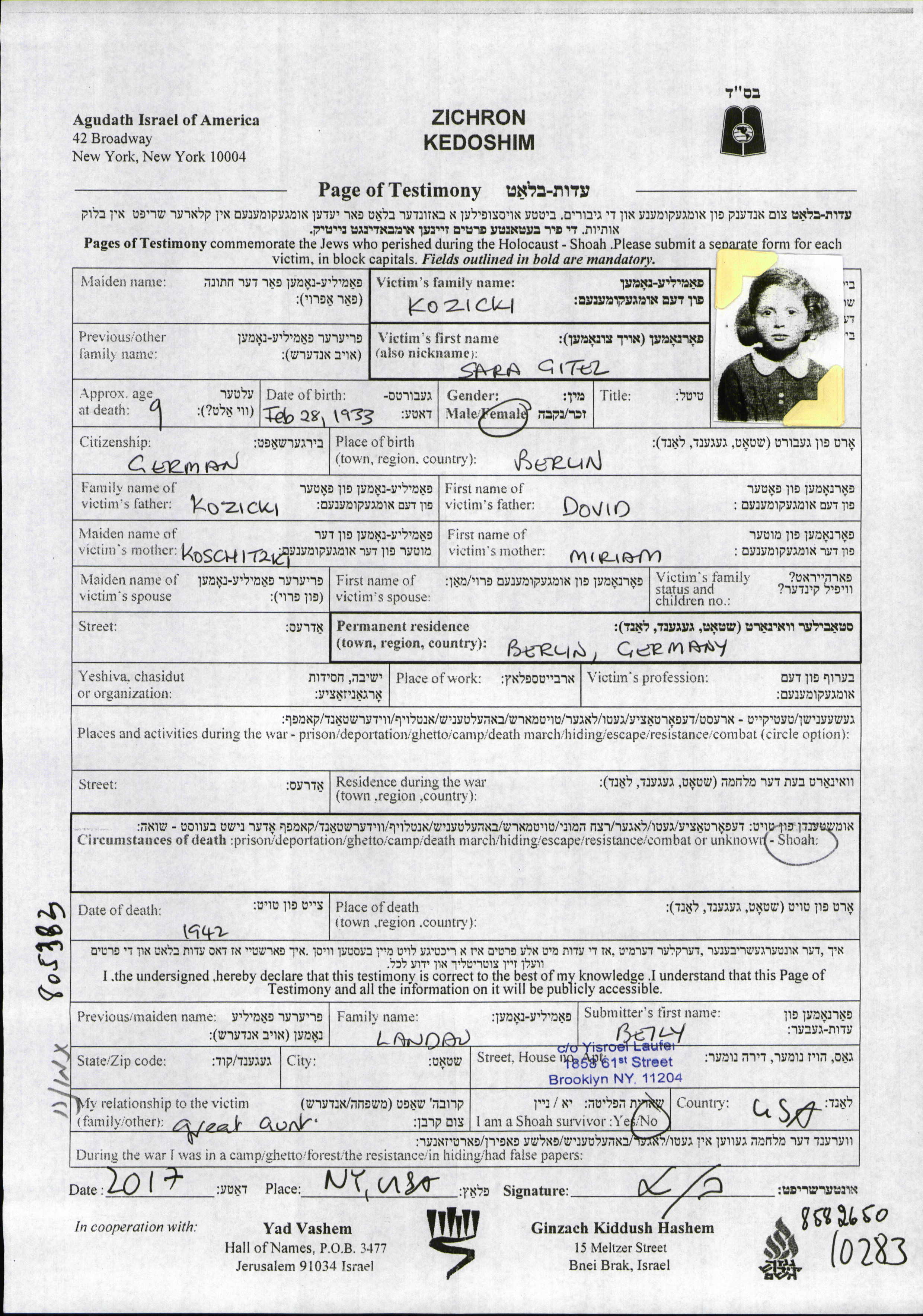 Kozicki | Sara Gitel | 1933 | Berlin, Deutsches Reich | Gedenkblatt |