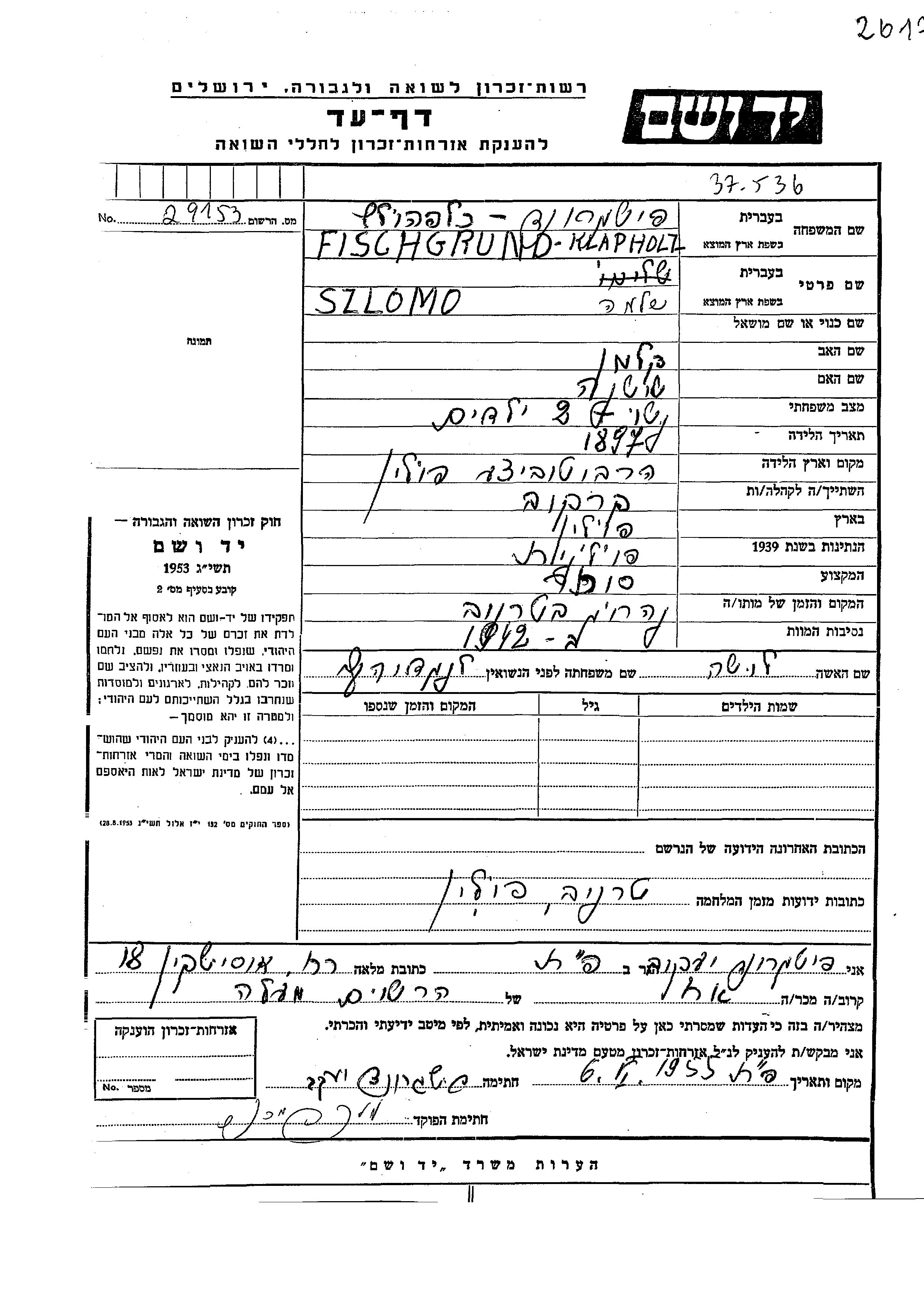 Szlomo Fischgrund Klapholz wurde im Jahr 1897 in Harbutowice, Polen geboren. Er war der Sohn von Kalman und Shoshana. Er war Kaufmann/-frau und mit Lusha, geb. Langdorf Verheiratet. Vor dem Zweiten Weltkrieg lebte er in Krakow, Polen. Während des Krieges war er in Tarnow, Polen.
