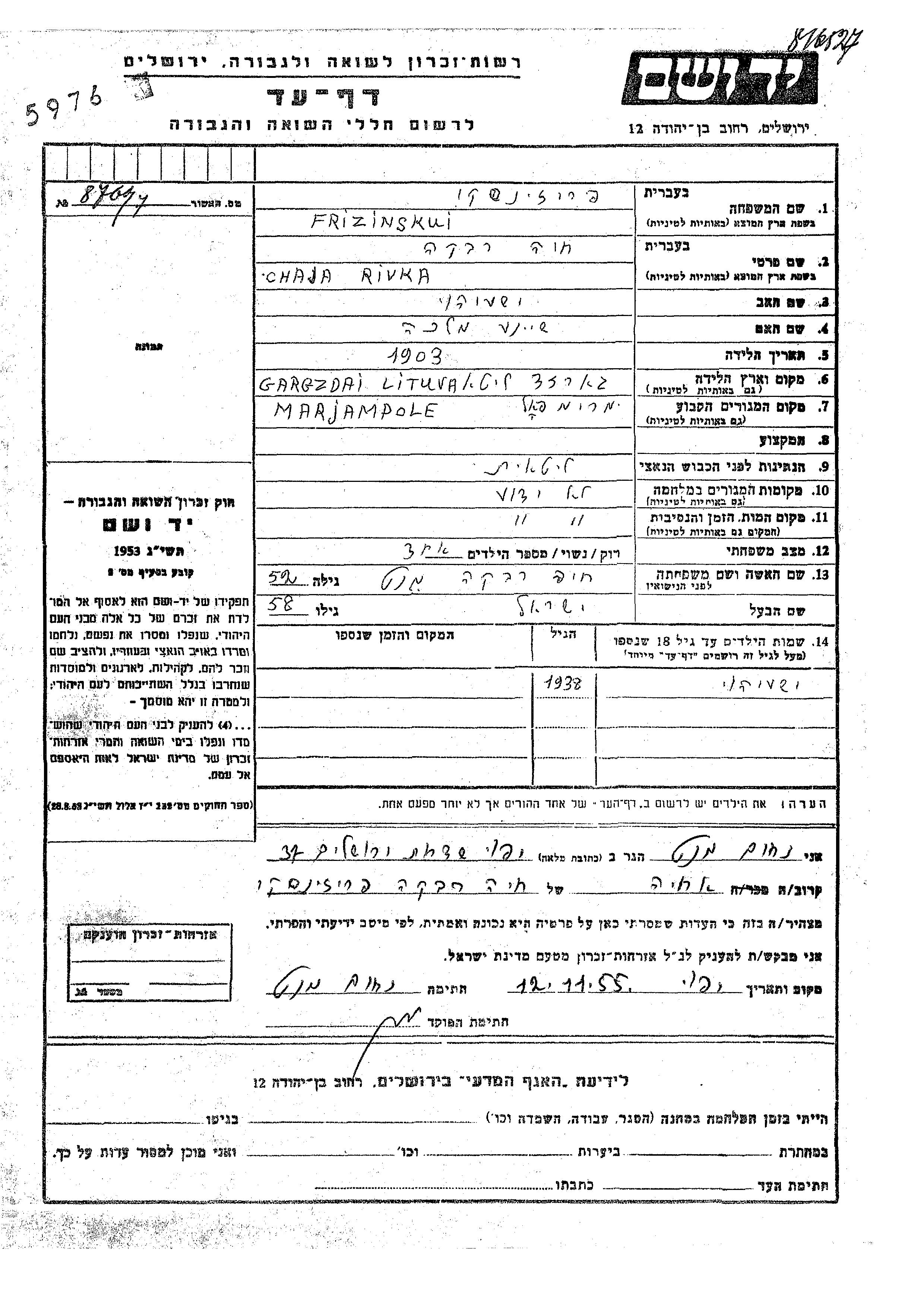 Chaja Rivka Frizinskui, geb. Ment wurde im Jahr 1903 in Gargzdai, Litauen geboren. Sie war die Tochter von Yeshayahu und Sheine Malka. Sie war mit Yisrael Verheiratet. Vor dem Zweiten Weltkrieg lebte sie in Marjampol Miasto, Polen.