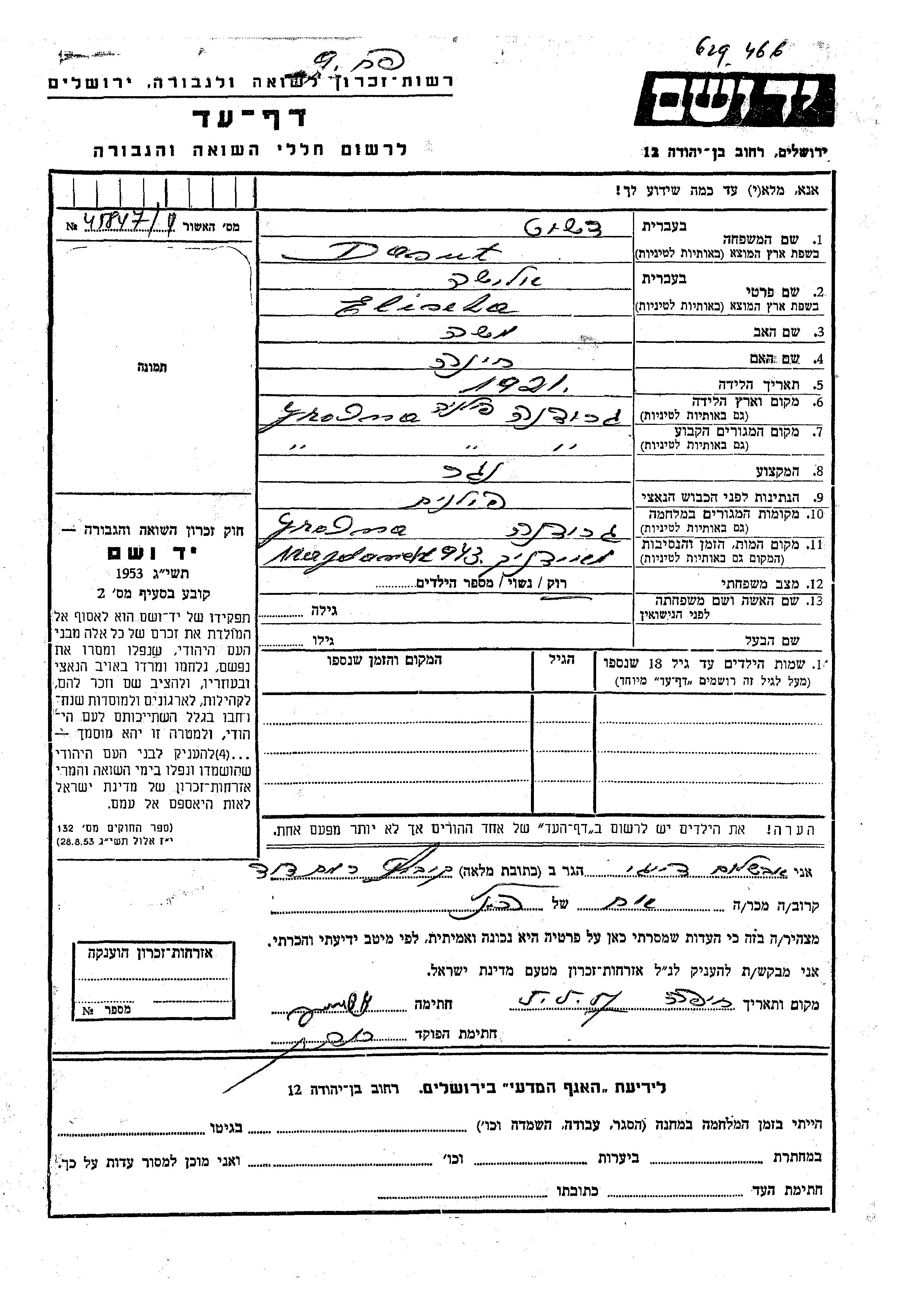 Elisha Daszut wurde im Jahr 1921 in Grodno, Polen geboren. Er war Zimmermann. Vor dem Zweiten Weltkrieg lebte er in Grodno, Polen.