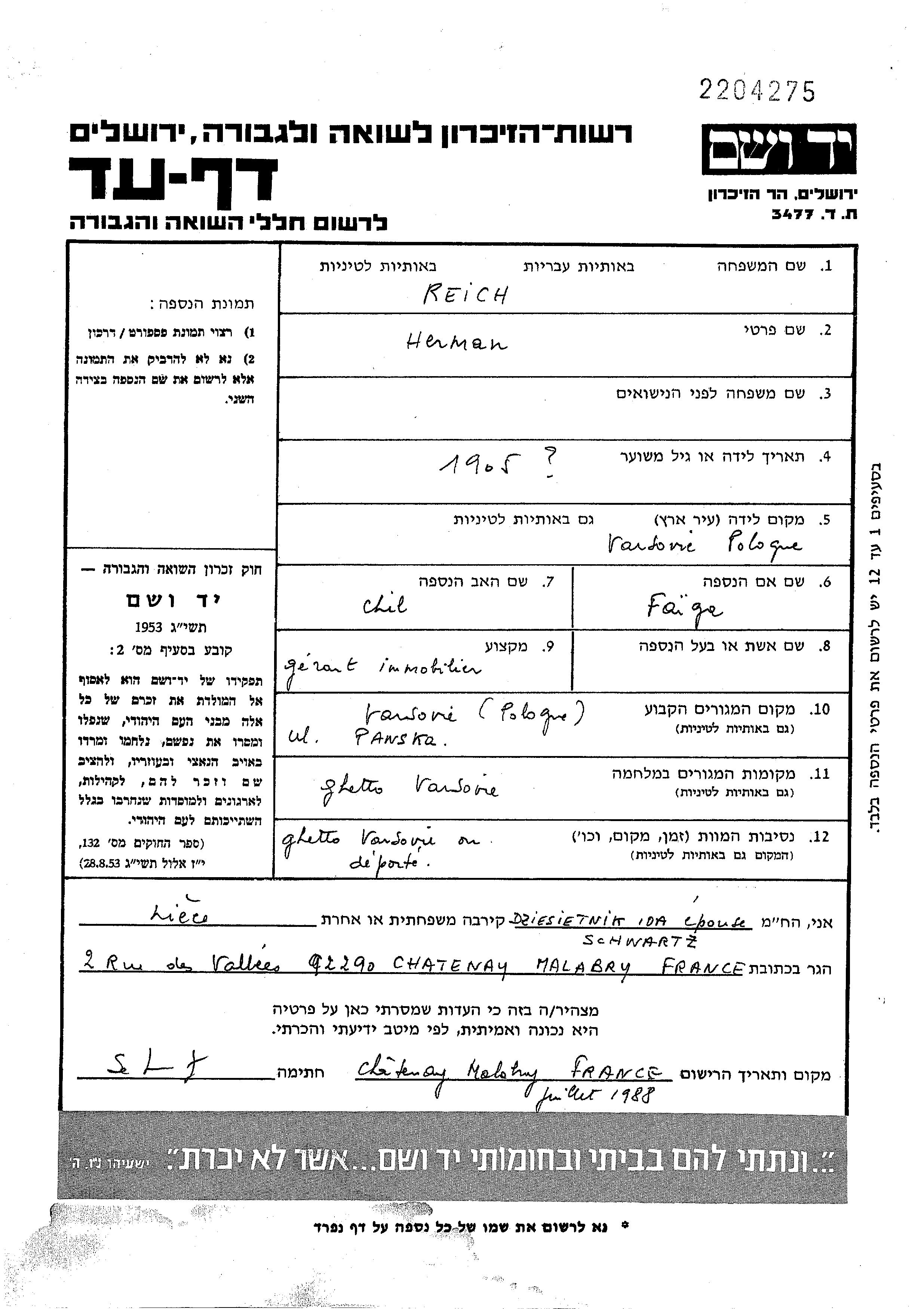 Herman Reich wurde im Jahr 1905 geboren. Er war Wirtschaftsleiter. Vor dem Zweiten Weltkrieg lebte er in Warszawa, Polen.