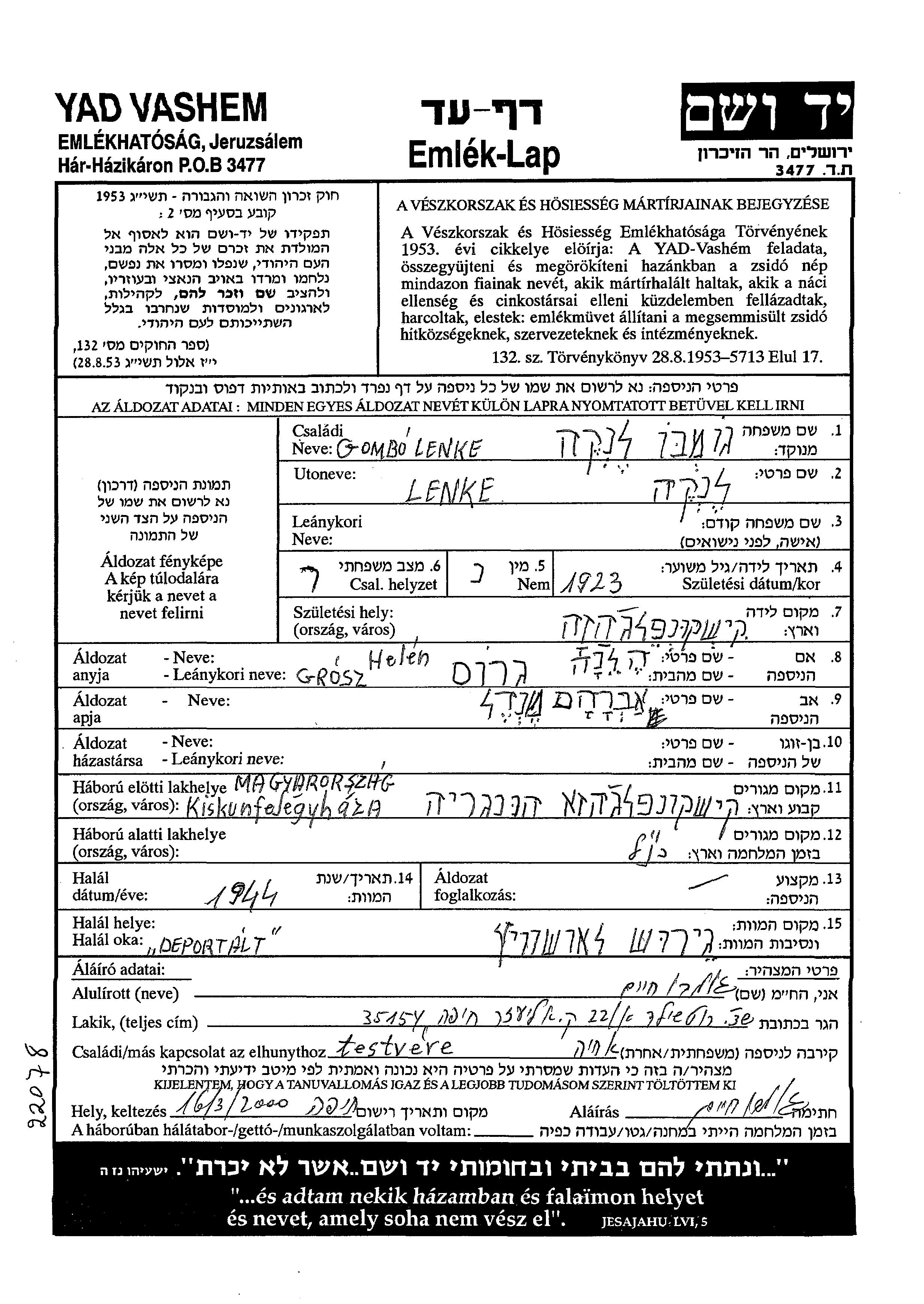 Lenke Gombo wurde im Jahr 1923 in Kiskunfelegyhaza, Ungarn geboren. Vor dem Zweiten Weltkrieg lebte sie in Kiskunfelegyhaza, Ungarn.