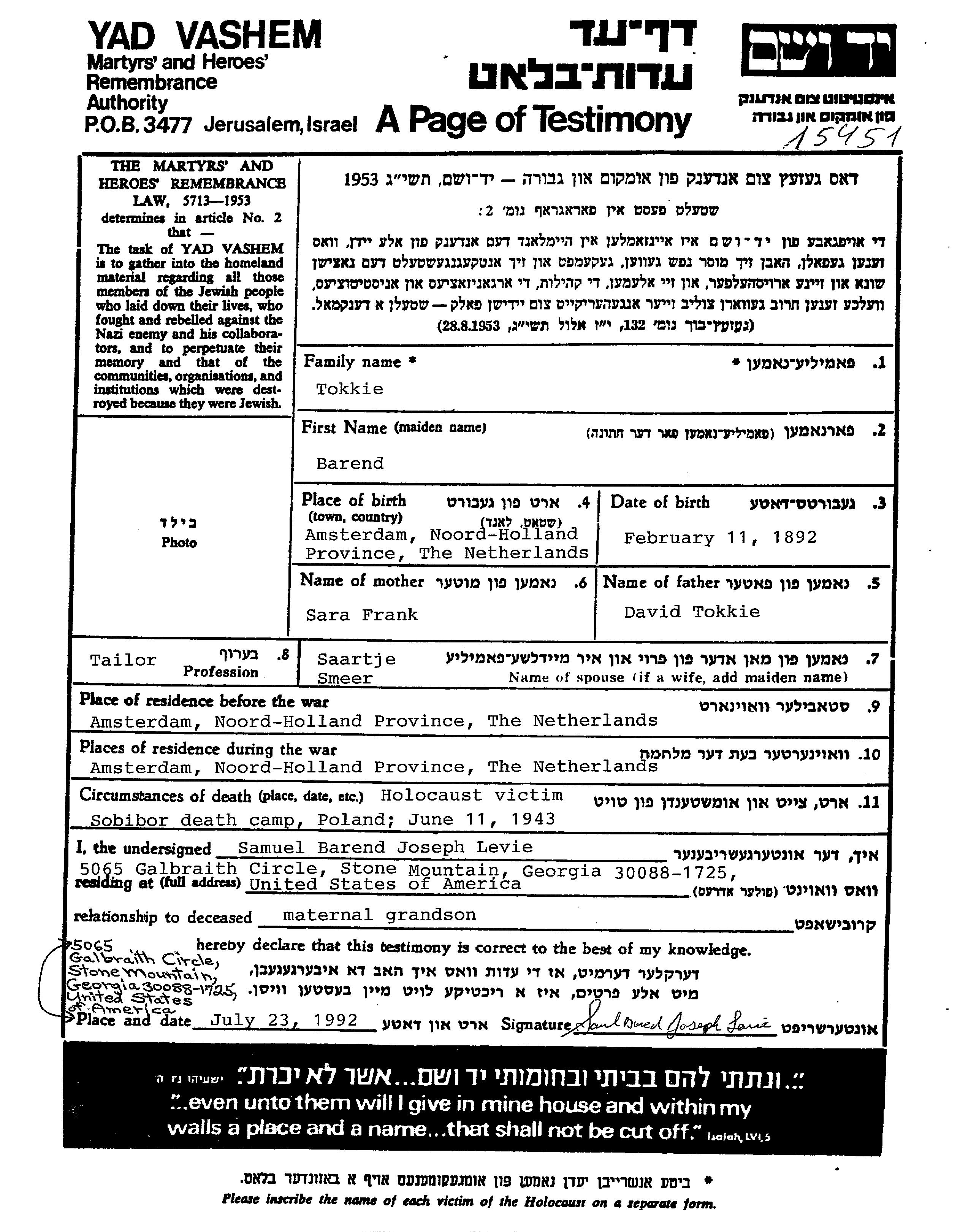 Barend Tokkie wurde im Jahr 1892 in Amsterdam, Niederlande geboren. Er war Schneider. Vor dem Zweiten Weltkrieg lebte er in Amsterdam, Niederlande.