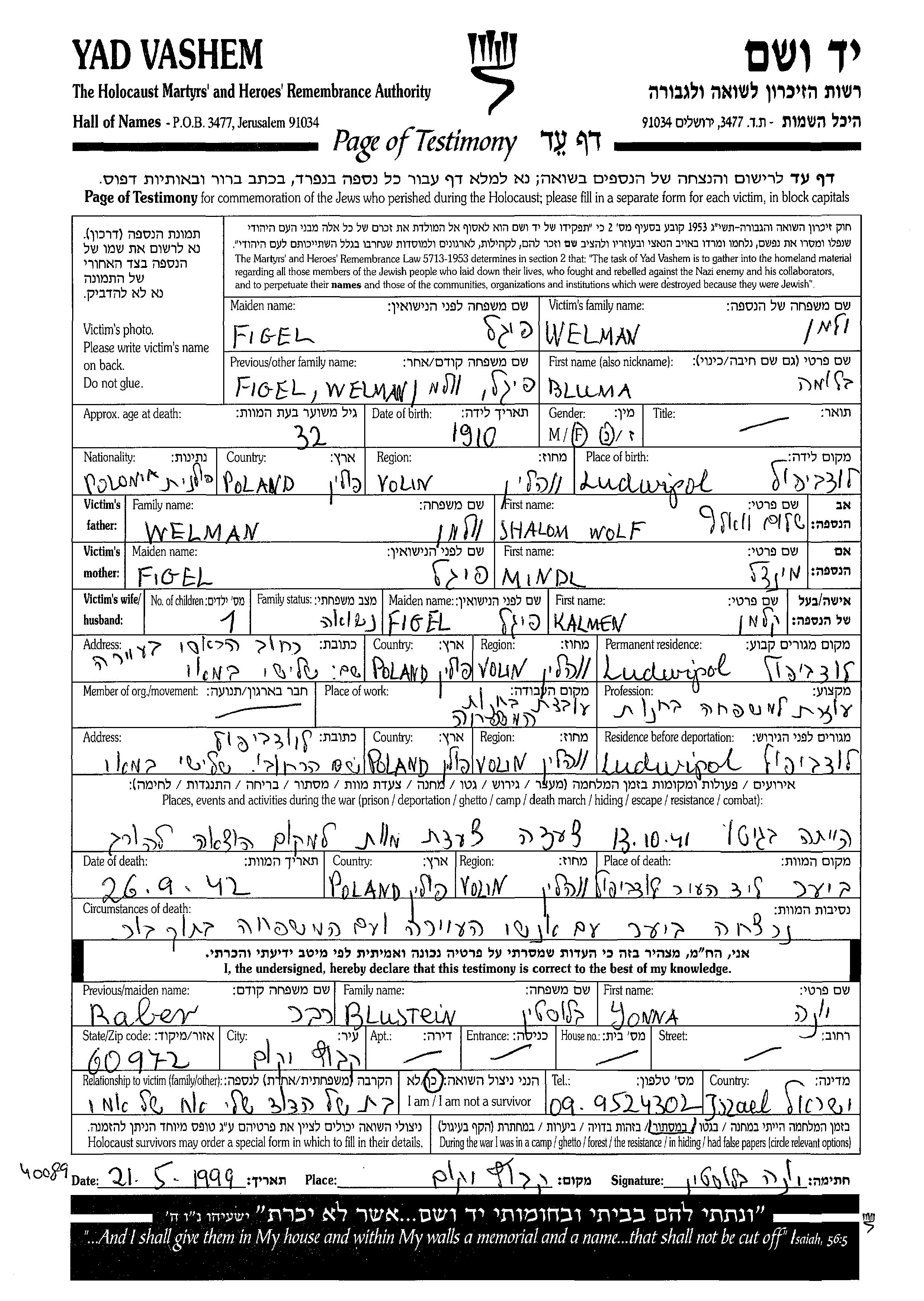 Bluma Welman, geb. Figel wurde im Jahr 1910 in Ludwipol, Polen geboren. Vor dem Zweiten Weltkrieg lebte sie in Ludwipol, Polen.