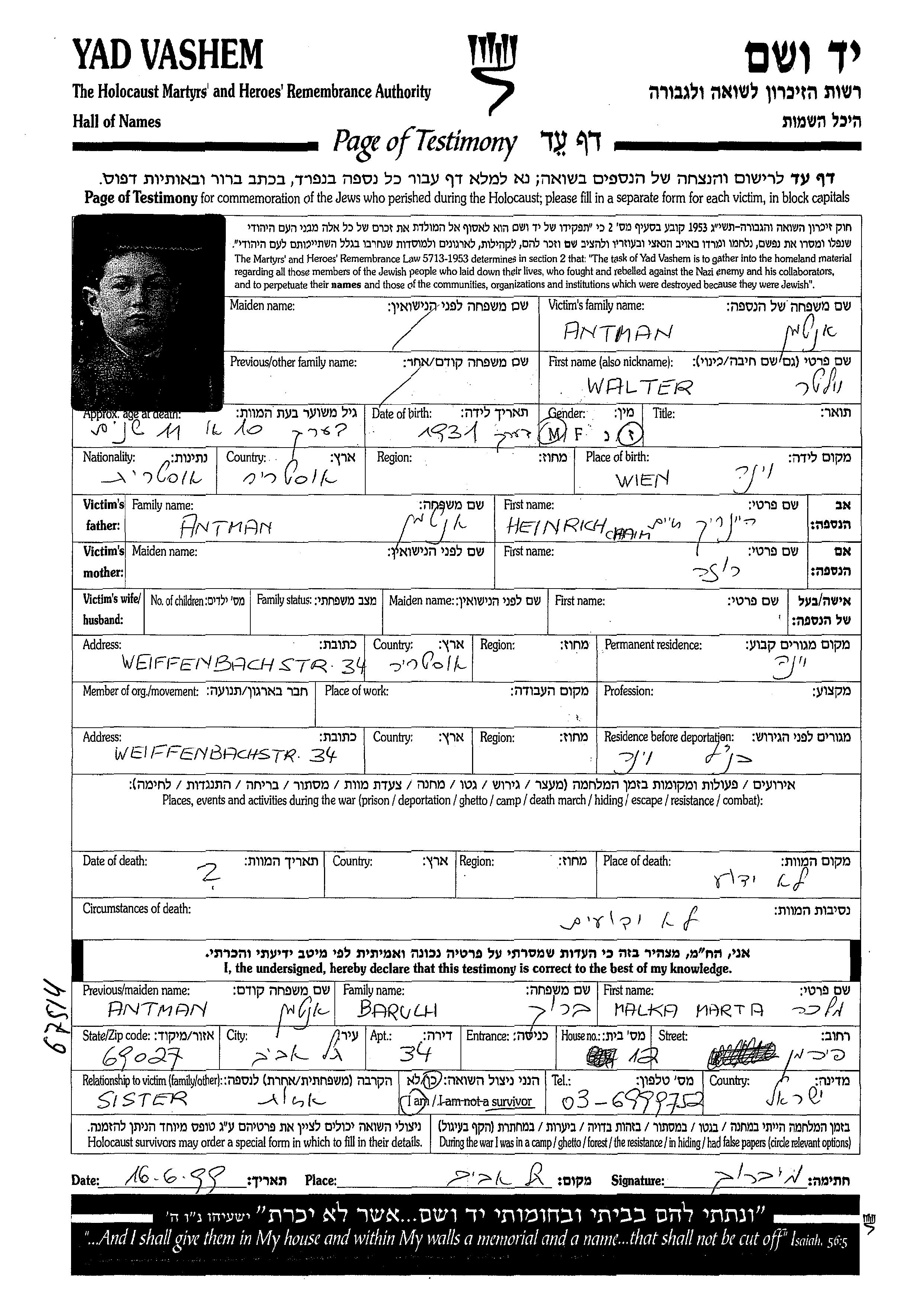 Valter Antmann wurde im Jahr 1931 in Wien, Österreich geboren. Vor dem Zweiten Weltkrieg lebte er in Wien, Österreich.