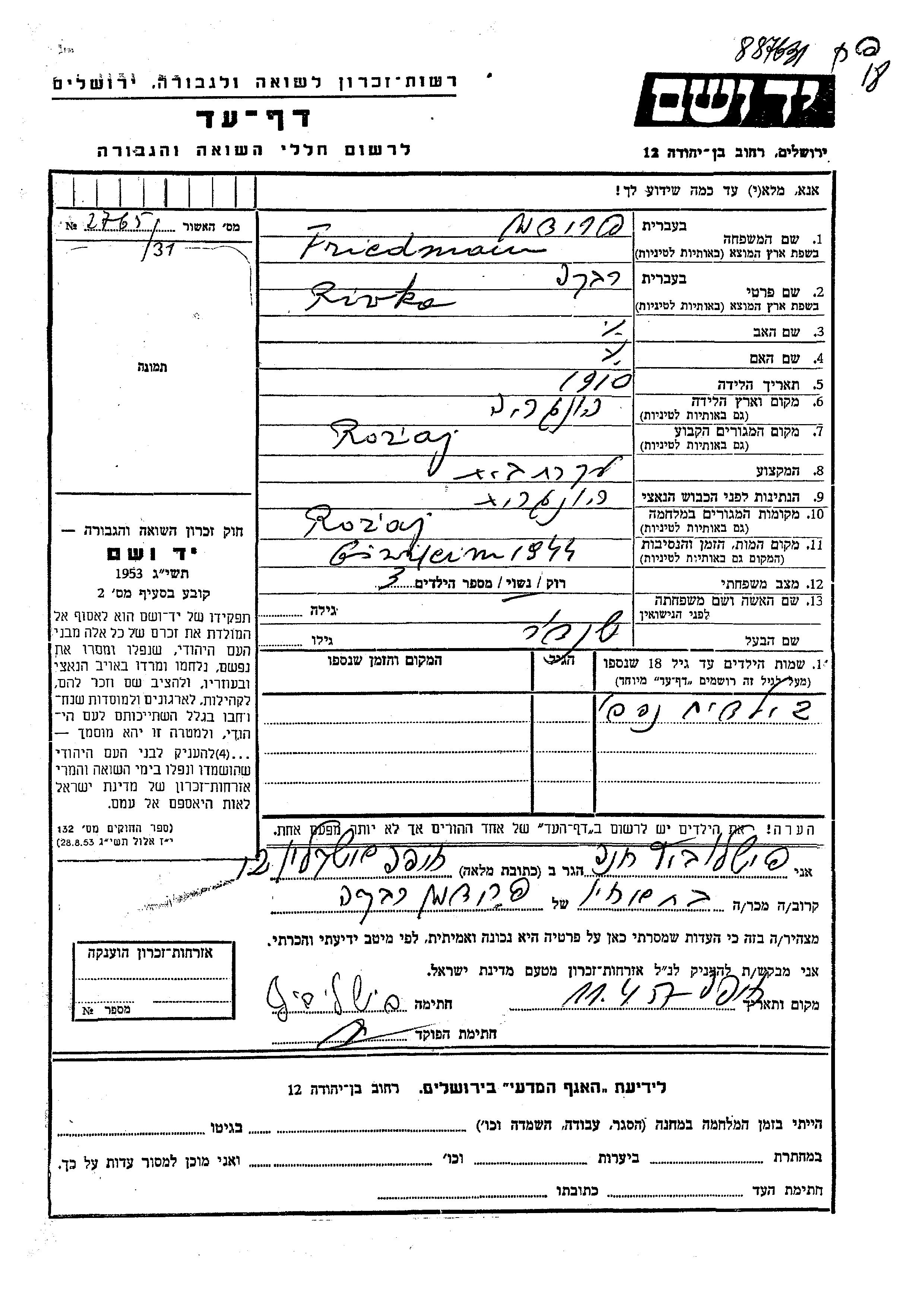 Riwka Friedman wurde im Jahr 1910 in Ungarn geboren. Sie war Hausfrau und mit Sandor Verheiratet. Vor dem Zweiten Weltkrieg lebte sie in Rozaj, Ungarn. Während des Krieges war sie in Rozaj, Ungarn.
