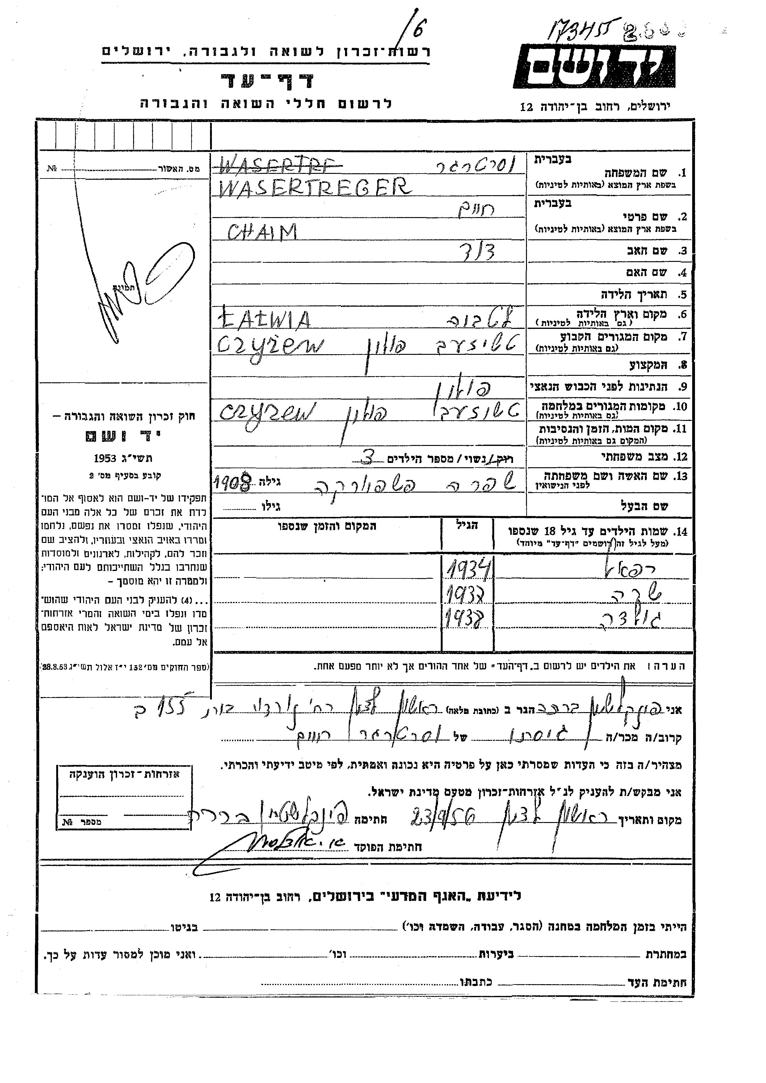 Golda Wasertreger wurde im Jahr 1938 geboren. Vor dem Zweiten Weltkrieg lebte sie in Czyzew, Polen.