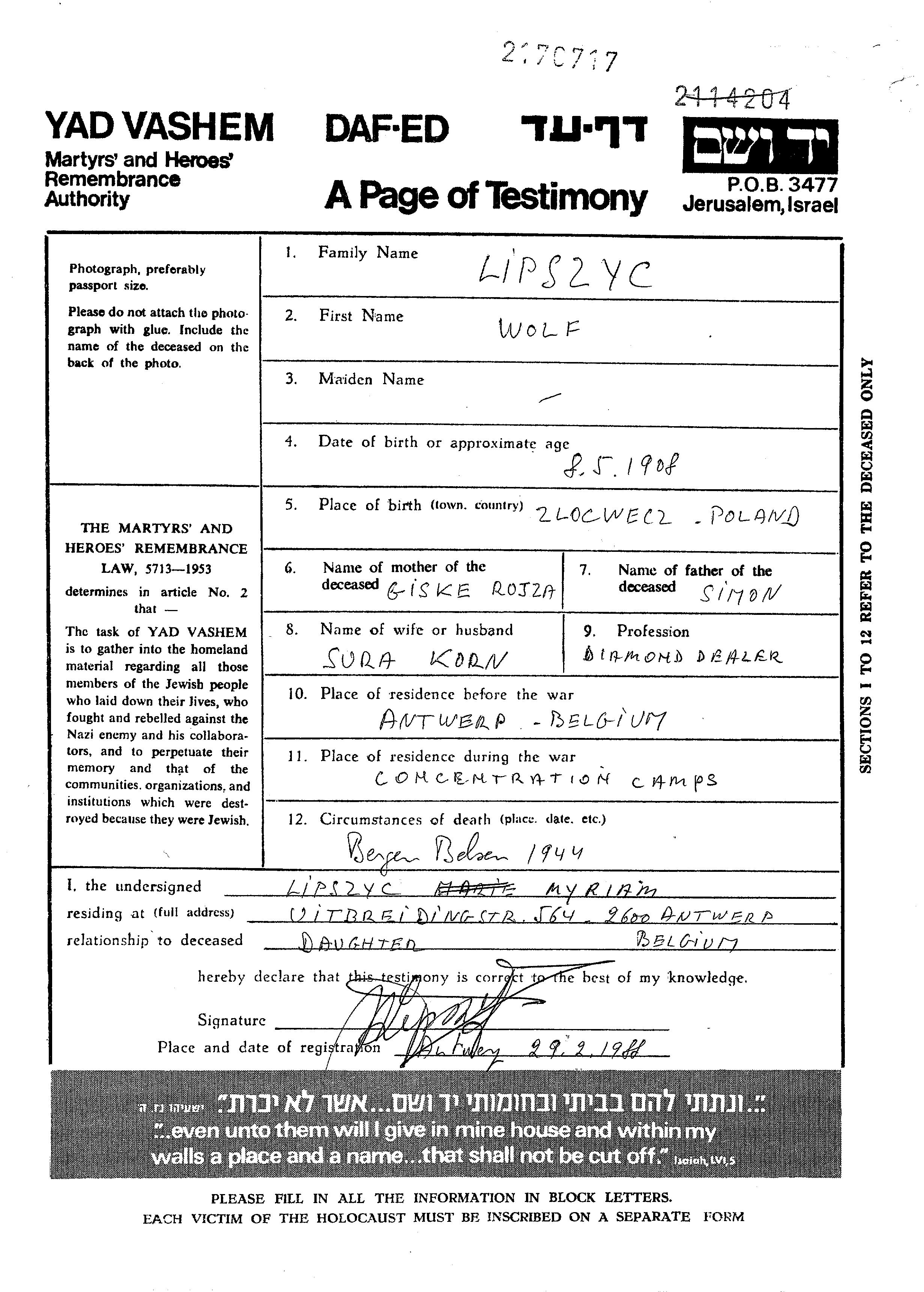 Zeev Volf Lipszyc wurde im Jahr 1908 in Zloczew, Polen geboren. Er war Goldschmied/-in. Vor dem Zweiten Weltkrieg lebte er in Antwerpen, Belgien.