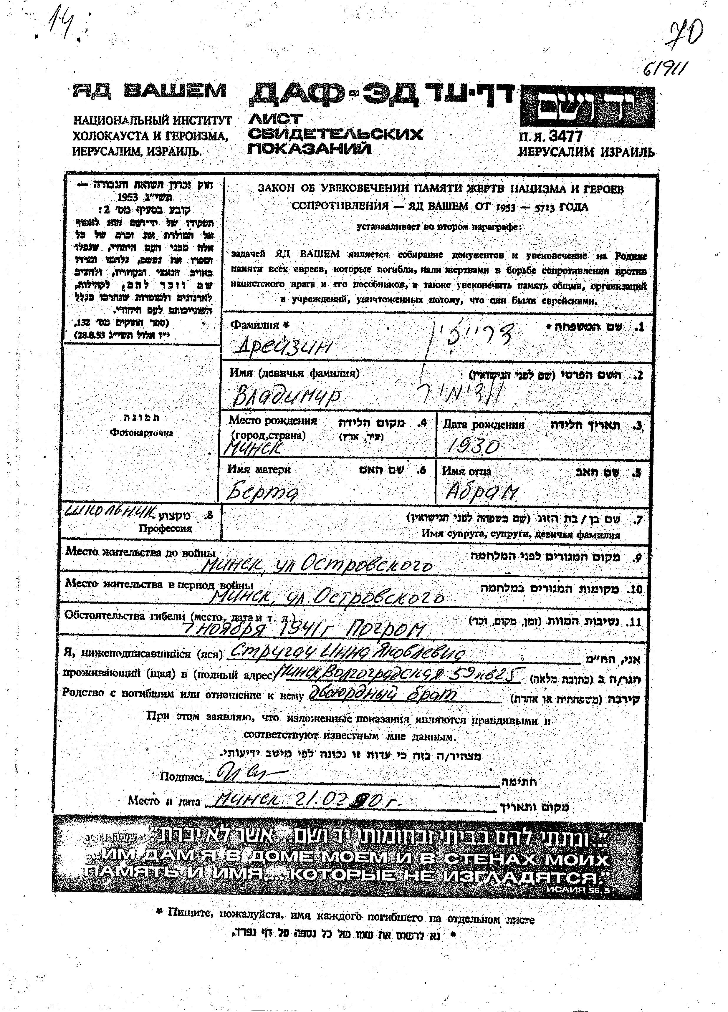 Vladimir Dreizin wurde im Jahr 1930 in Minsk, Weißrussland (UdSSR) geboren. Er war Schüler/-in. Vor dem Zweiten Weltkrieg lebte er in Minsk, Weißrussland (UdSSR).