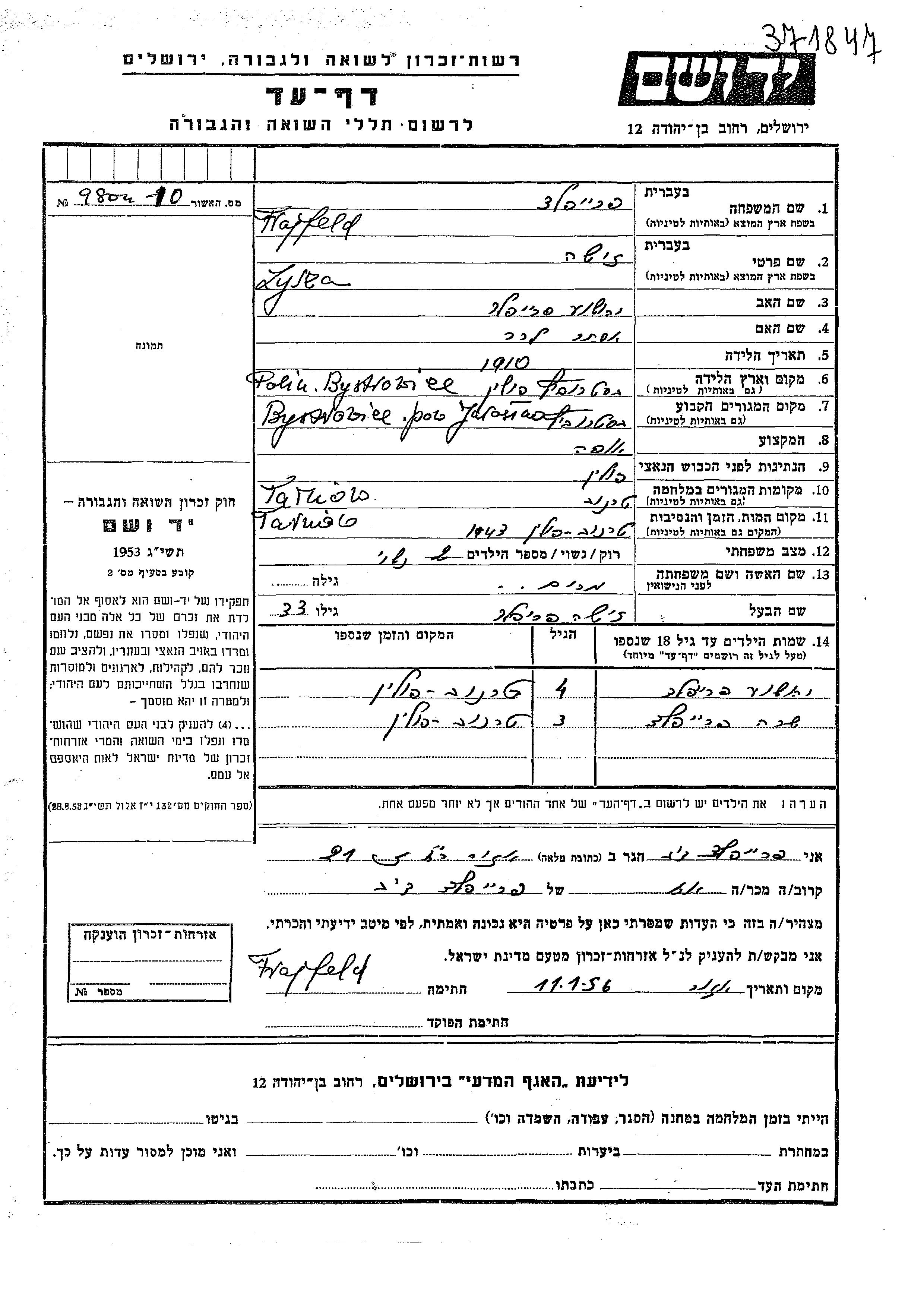 Zysza Frajfeld wurde im Jahr 1910 geboren. Er war der Sohn von Yehoshua und Ester, geb. Lerer. Er war Bäcker/-in und mit Miriam Verheiratet. Während des Krieges war er in Tarnow, Polen.