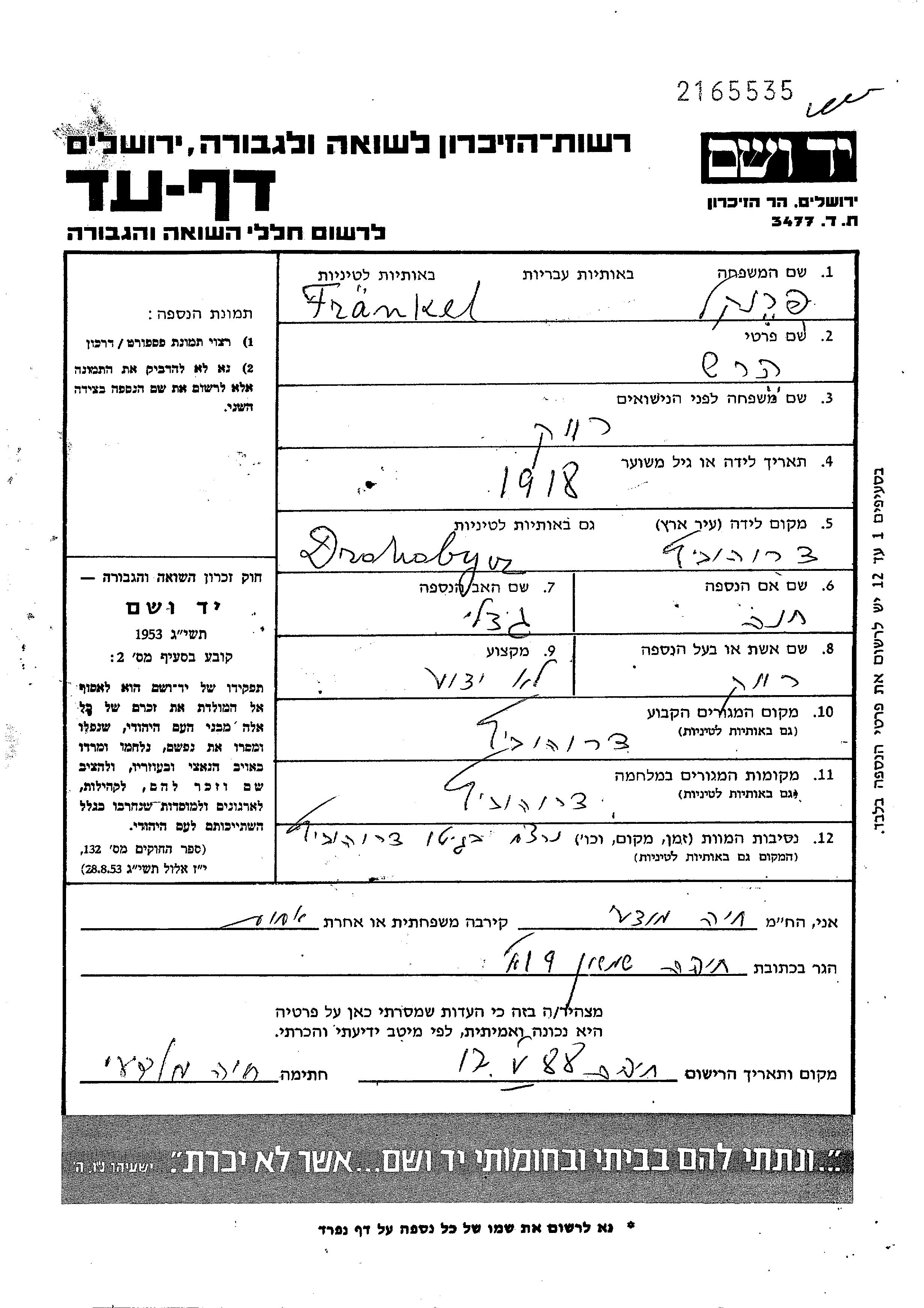 Hersh Natan Shterenbach Fränkel wurde im Jahr 1918 in Drohobycz, Polen geboren. Vor dem Zweiten Weltkrieg lebte er in Drohobycz, Polen.