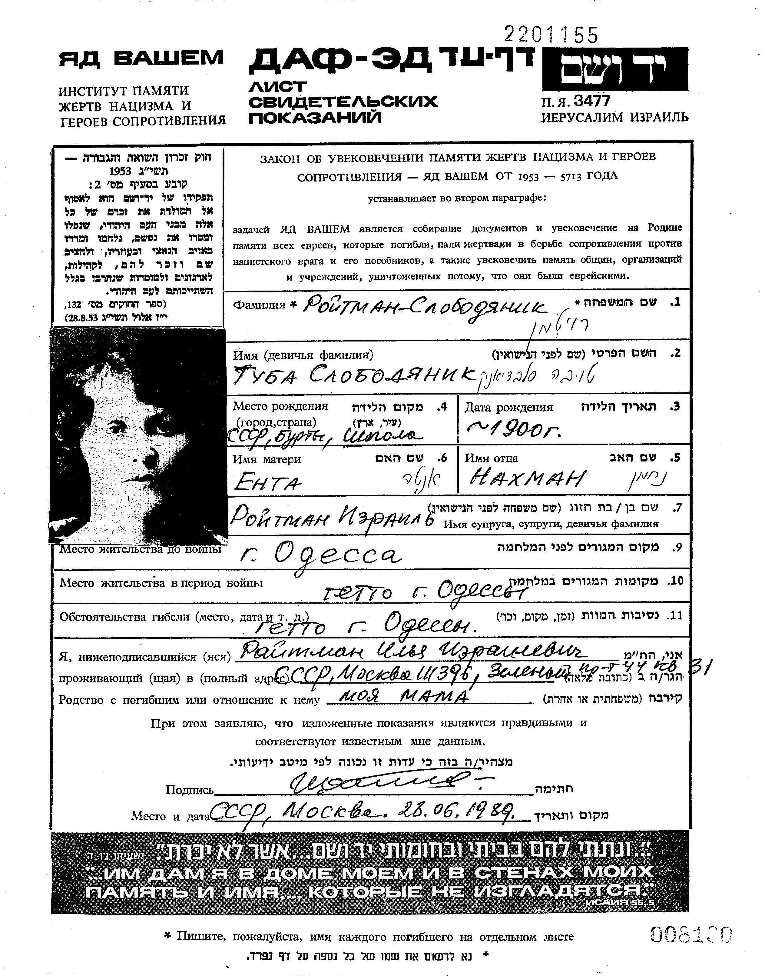 Tojba Tova Roitman, geb. Slobodyanik wurde im Jahr 1900 in Shpola, Ukraine (UdSSR) geboren. Vor dem Zweiten Weltkrieg lebte sie in Odessa, Ukraine (UdSSR).