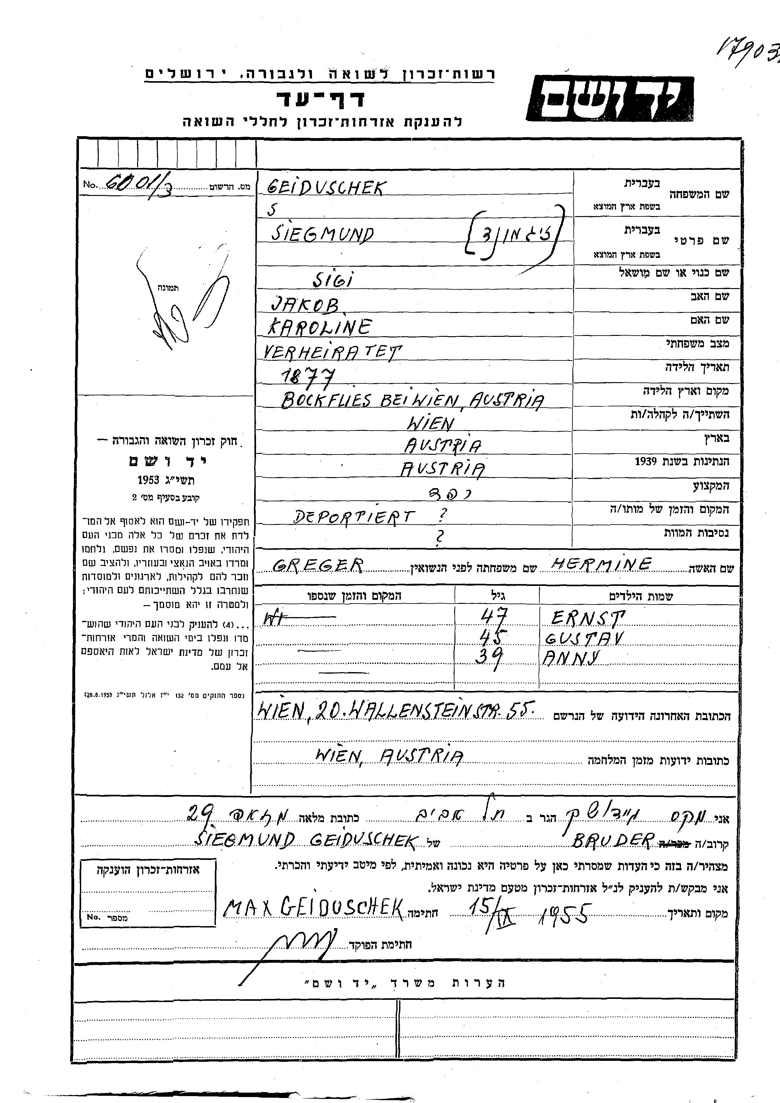 Siegmund Geiduschek wurde im Jahr 1876 in Bockfliesz, Österreich geboren. Er war Polsterer/-in. Vor dem Zweiten Weltkrieg lebte er in Wien, Österreich.