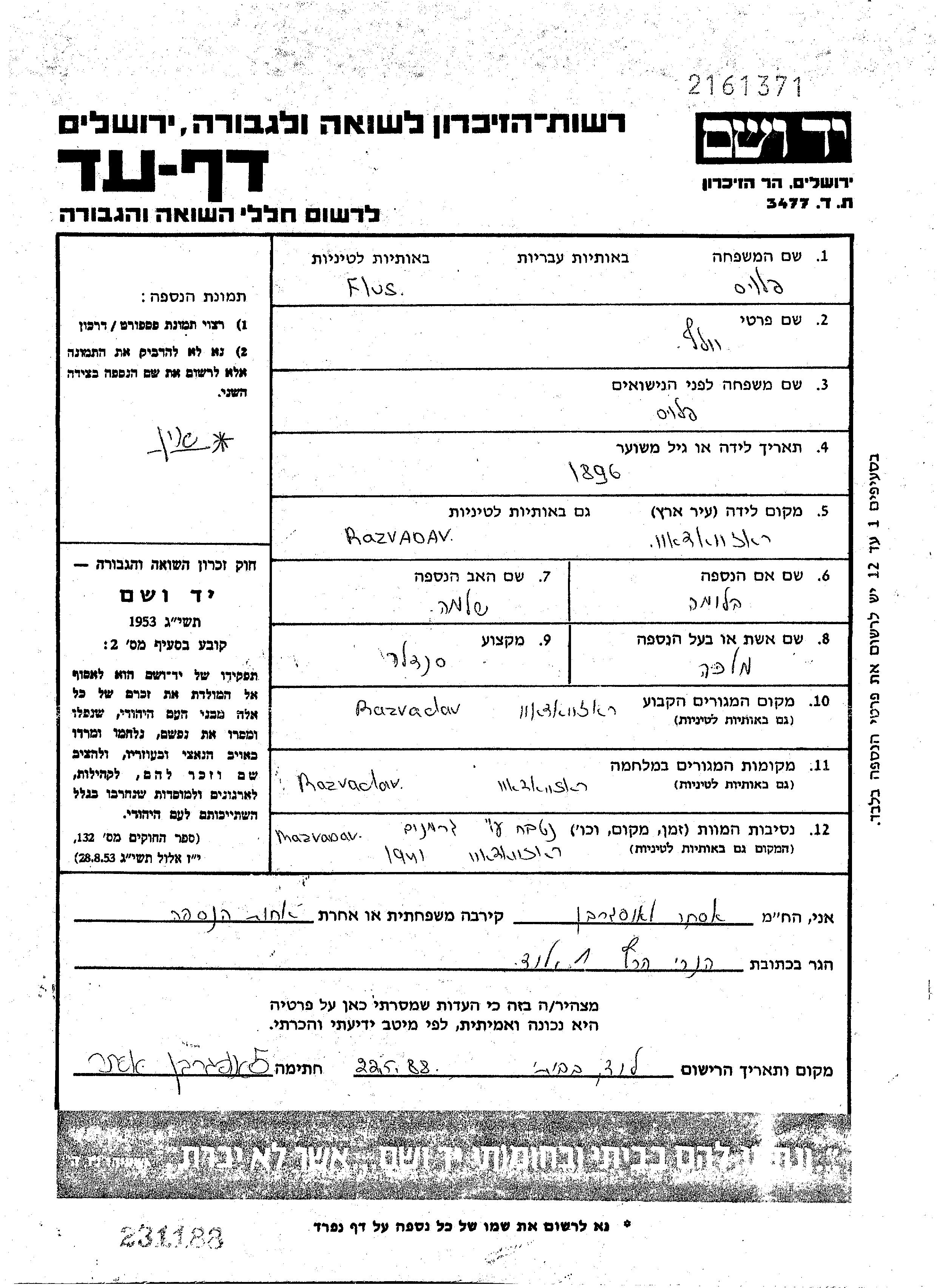 Volf Zeev Flus Plus wurde im Jahr 1896 in Rozwadów, Polen geboren. Er war Schuster/-in. Vor dem Zweiten Weltkrieg lebte er in Rozwadów, Polen.