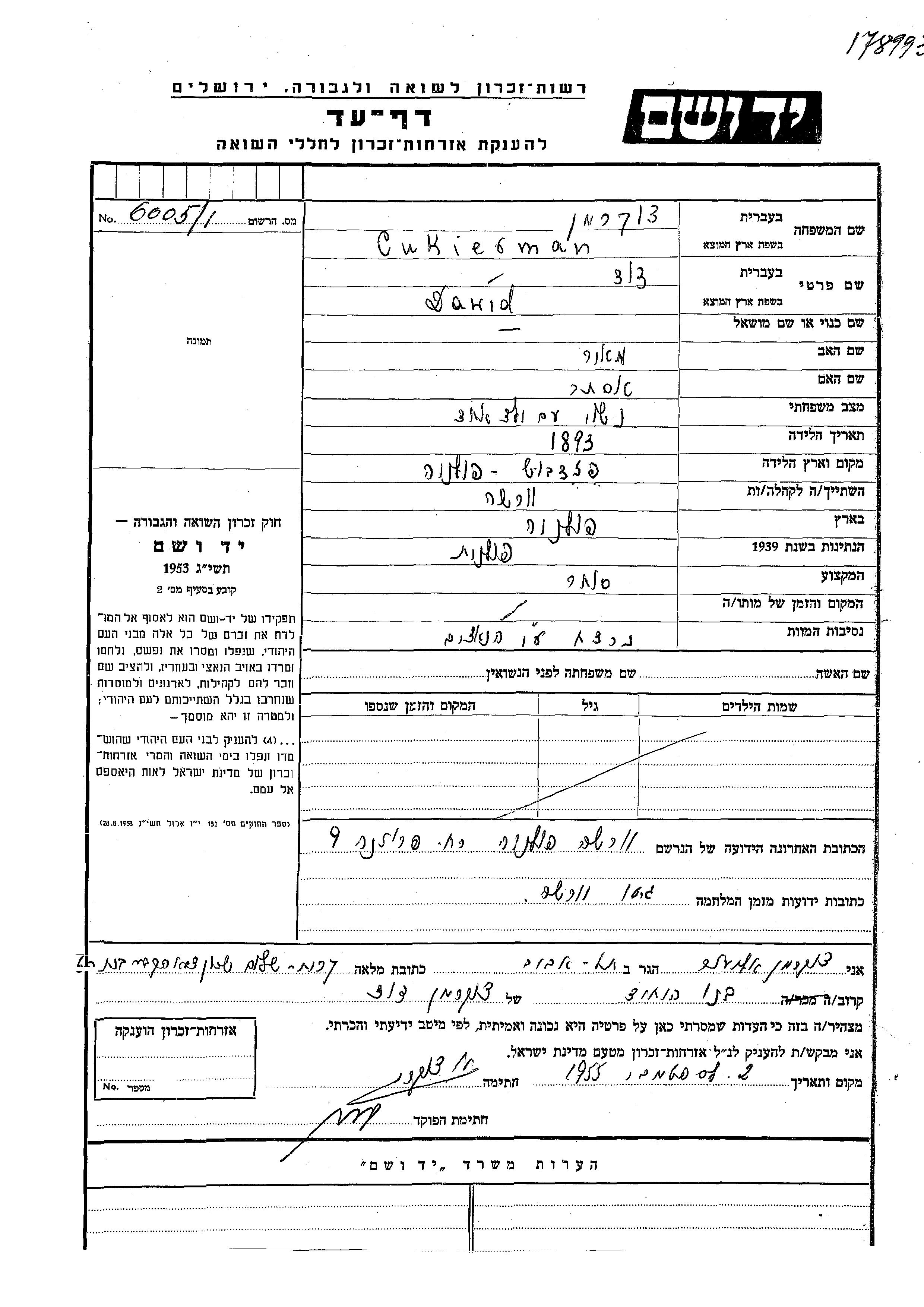 Cukierman Dawid 1893 Warszawa, Polen Gedenkblatt