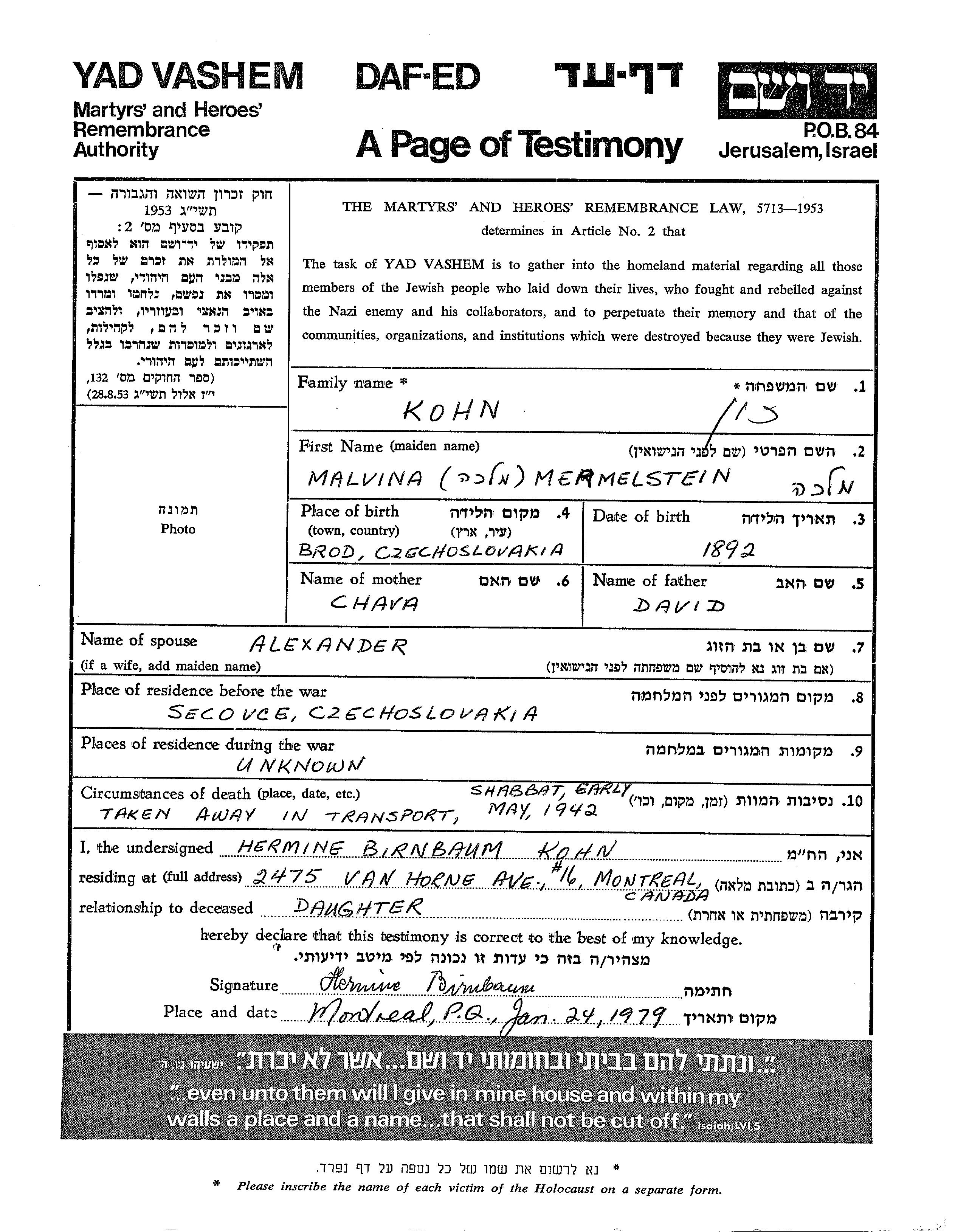 Kohn | Malvina Malka | 1891 | Secovce, Tschechoslowakei | Gedenkblatt |