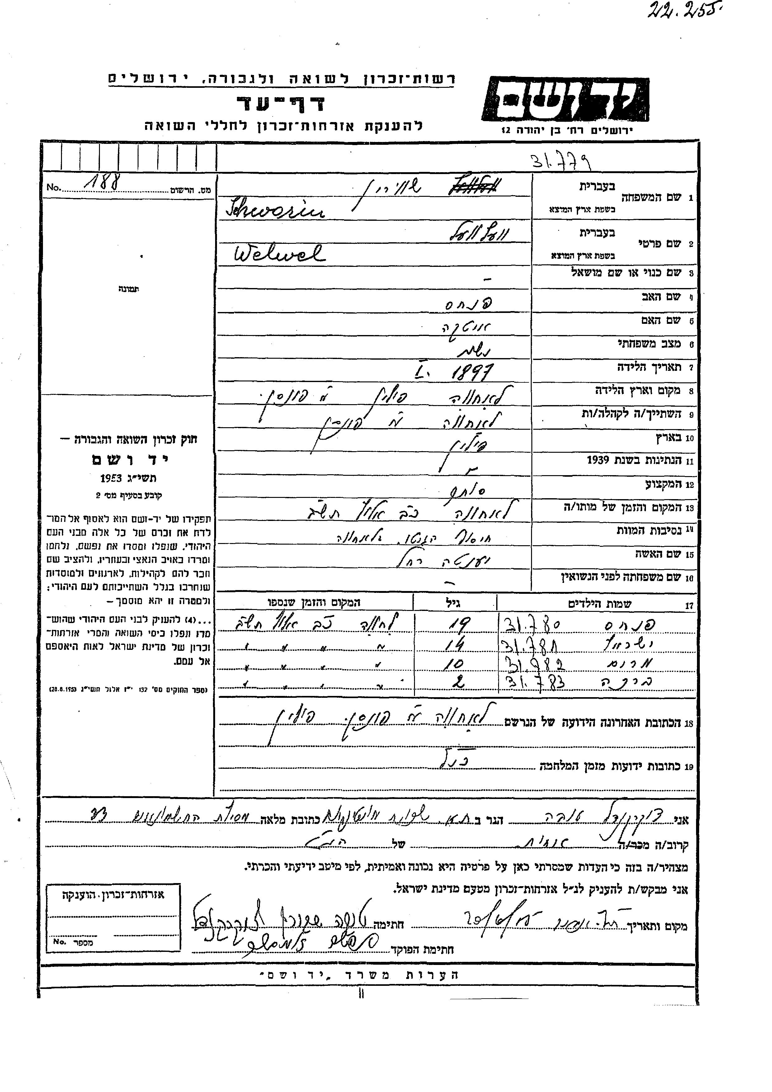 Welwel Zeev Shworin wurde in Lachwa, Polen geboren. Er war Kaufmann/-frau. Vor dem Zweiten Weltkrieg lebte er in Lachwa, Polen.