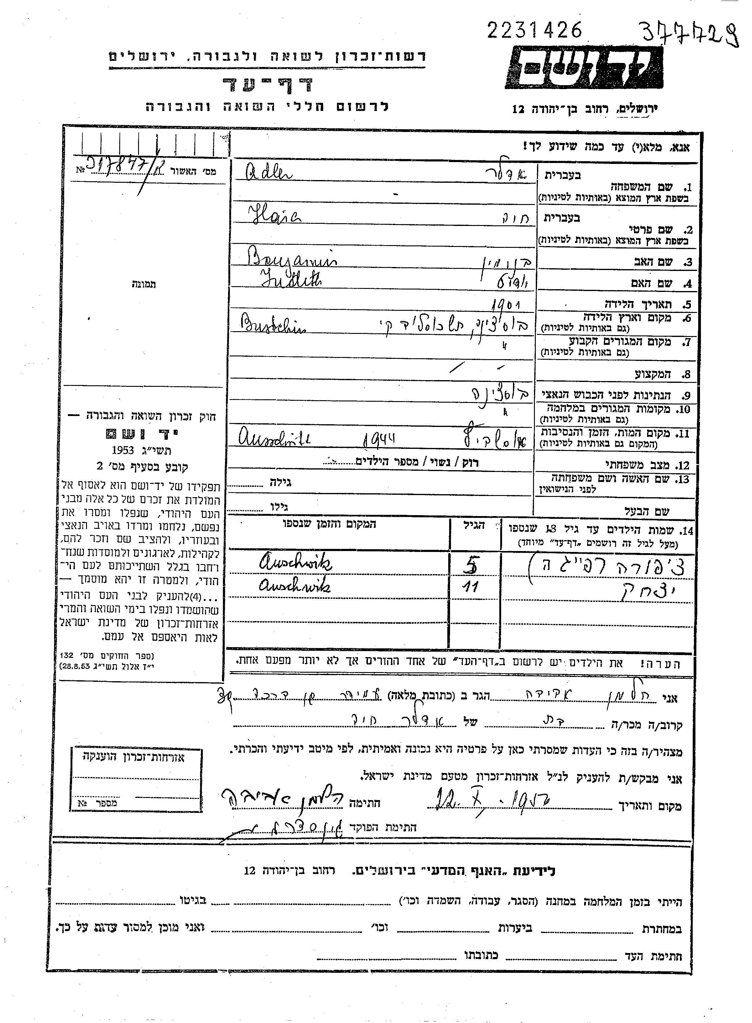 Khaia Adler wurde im Jahr 1901 in Bustina, Tschechoslowakei geboren. Vor dem Zweiten Weltkrieg lebte sie in Bustina, Tschechoslowakei.