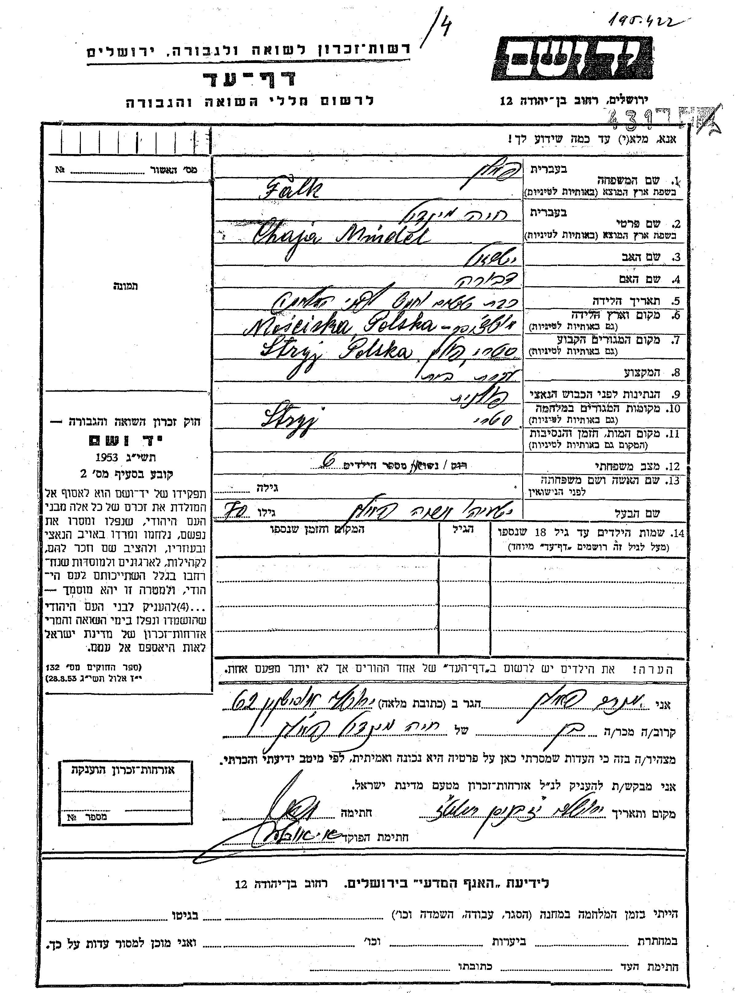 Khaia Mindel Falk, geb. Broiner wurde im Jahr 1875 in Mosciska, Polen geboren. Sie war Hausfrau. Vor dem Zweiten Weltkrieg lebte sie in Stryj, Polen.