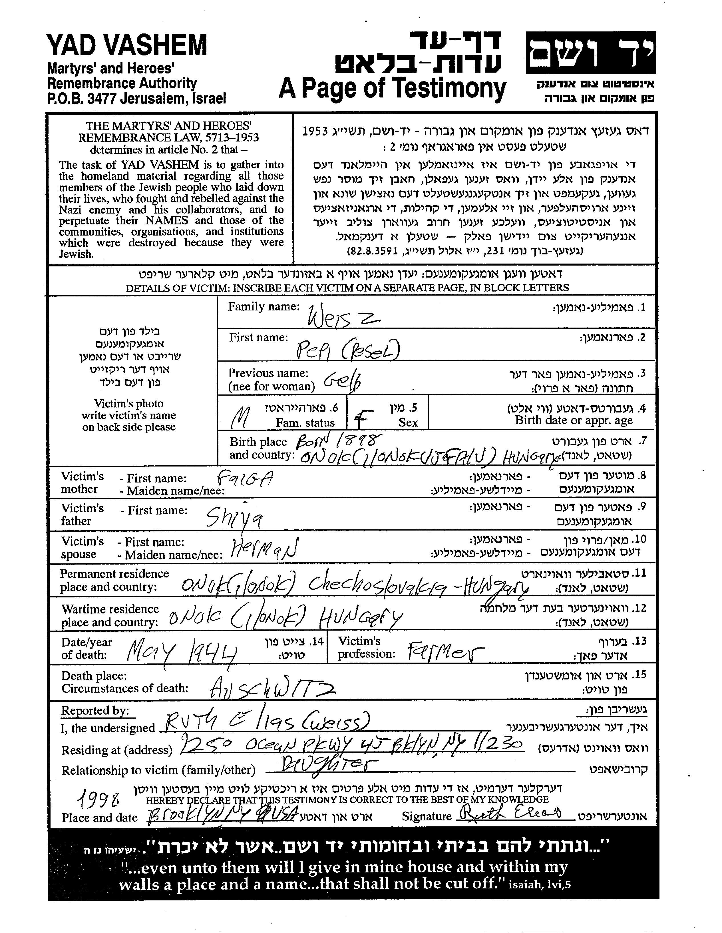 Pepi Pesel Weisz, geb. Gelb wurde im Jahr 1898 in Onok, Tschechoslowakei geboren. Sie war Landwirt. Vor dem Zweiten Weltkrieg lebte sie in Onok, Tschechoslowakei.