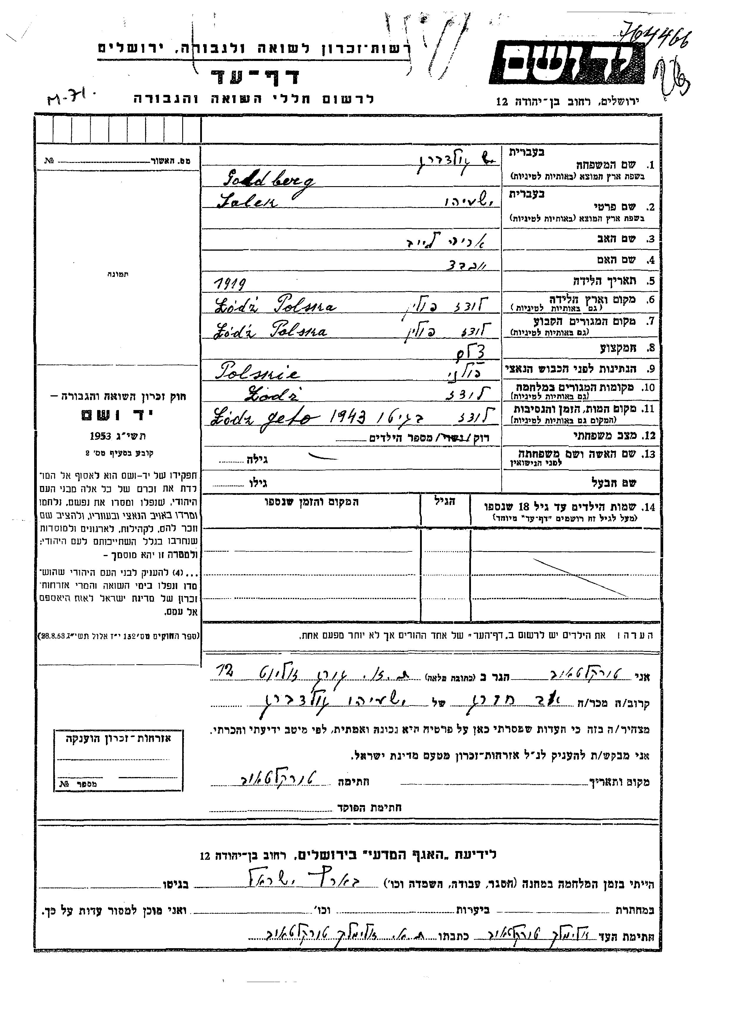 Salek Yeshayahu wurde in der Schoah ermordet. Todesort: Lodz, Polen im Jahr 1943.