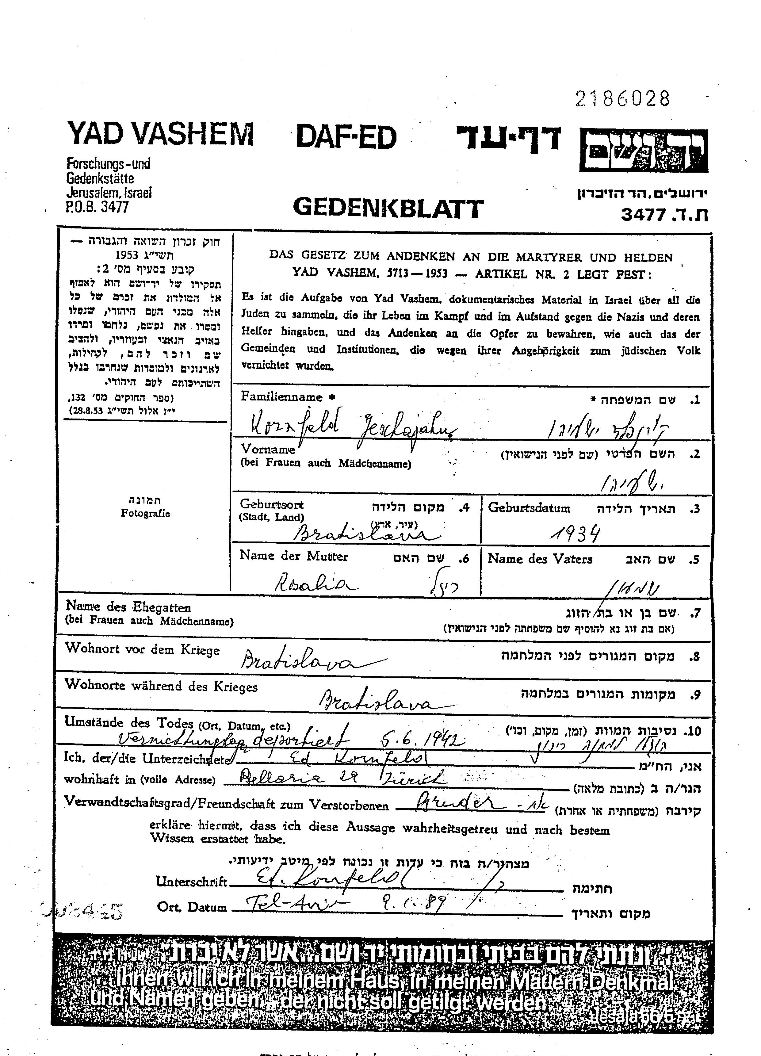 Shmuel Yeshayahu Yeshiyah Kornfeld wurde im Jahr 1934 in Bratislava, Tschechoslowakei geboren. Vor dem Zweiten Weltkrieg lebte er in Bratislava, Tschechoslowakei. Shmuel Yeshayahu Yeshiyah wurde in der Schoah ermordet. Todesort: unbekannter Ort im Jahr 05/06/1942.