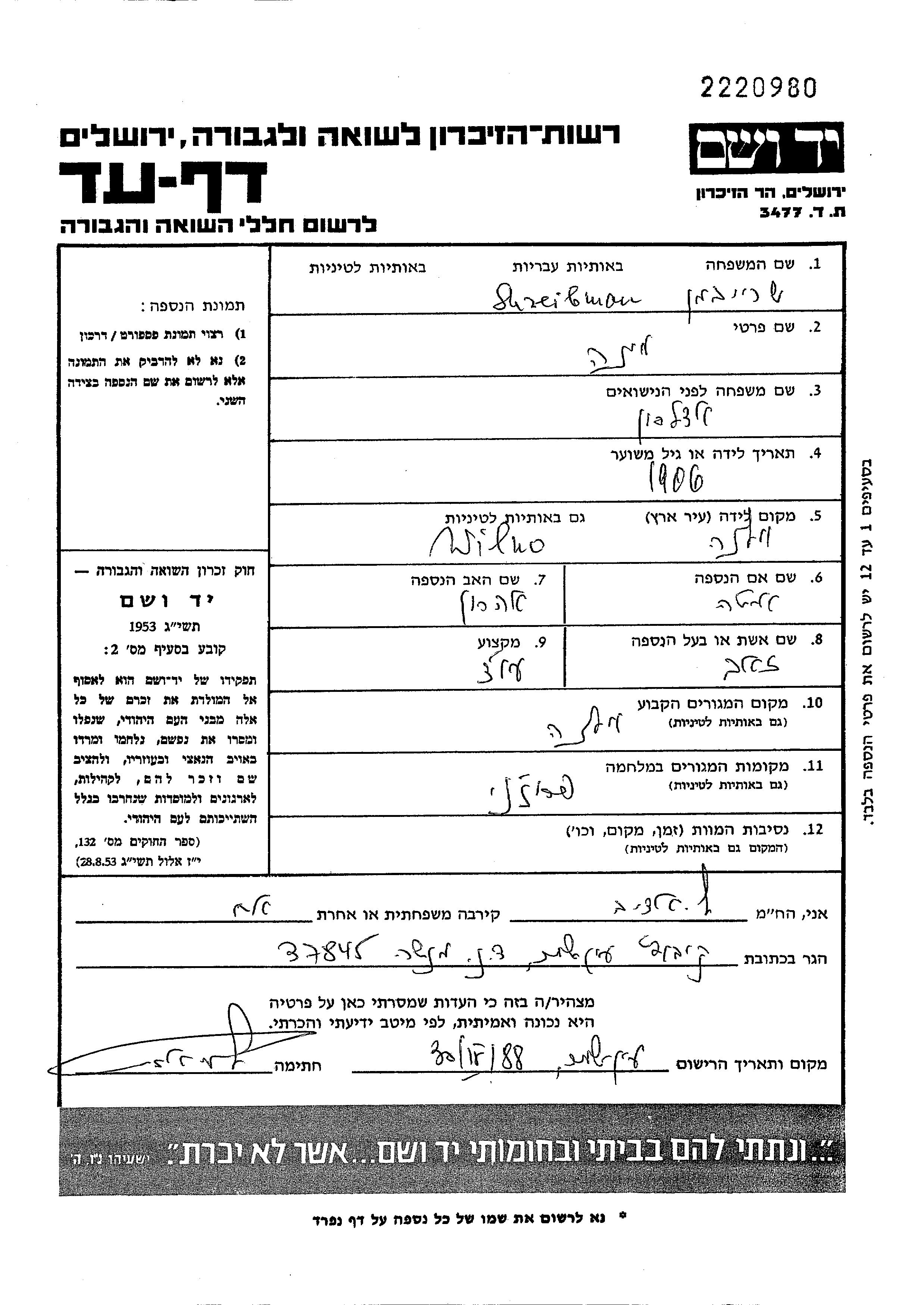 Mina Schreibman, geb. Edelson wurde im Jahr 1906 in Wilno, Polen geboren. Sie war Hausfrau. Vor dem Zweiten Weltkrieg lebte sie in Pruzana, Polen.