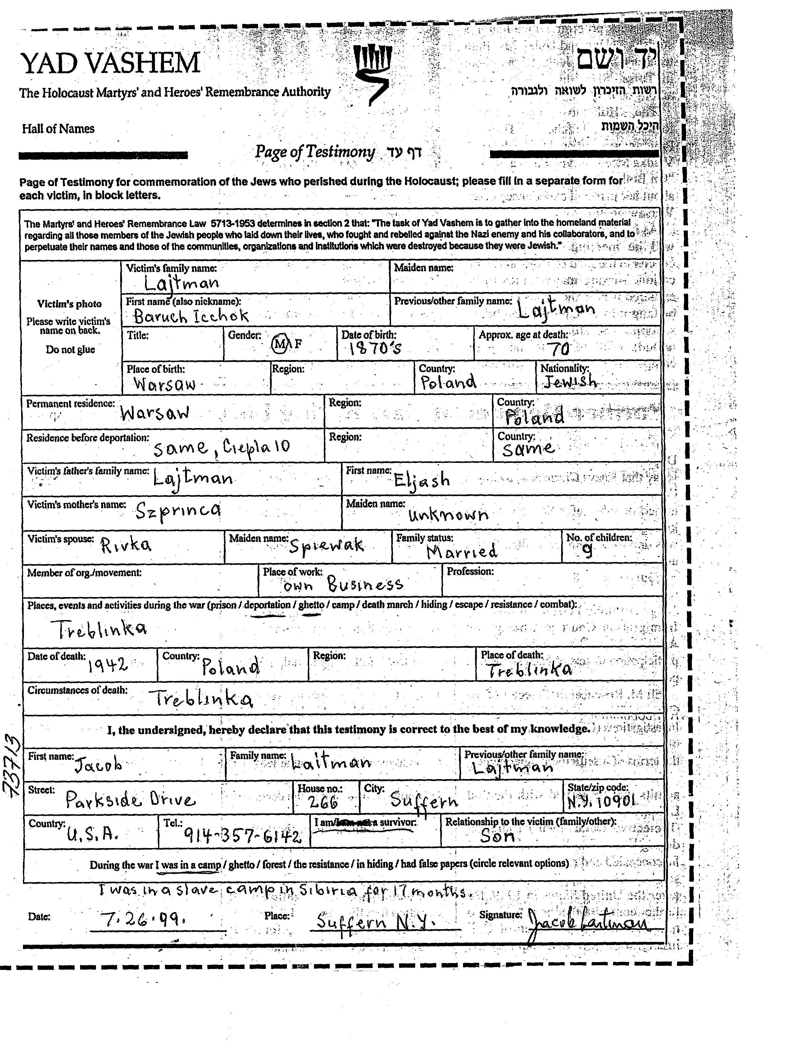 Barukh Yitzkhak wurde in der Schoah ermordet. Todesort: Treblinka, Polen im Jahr 1942.