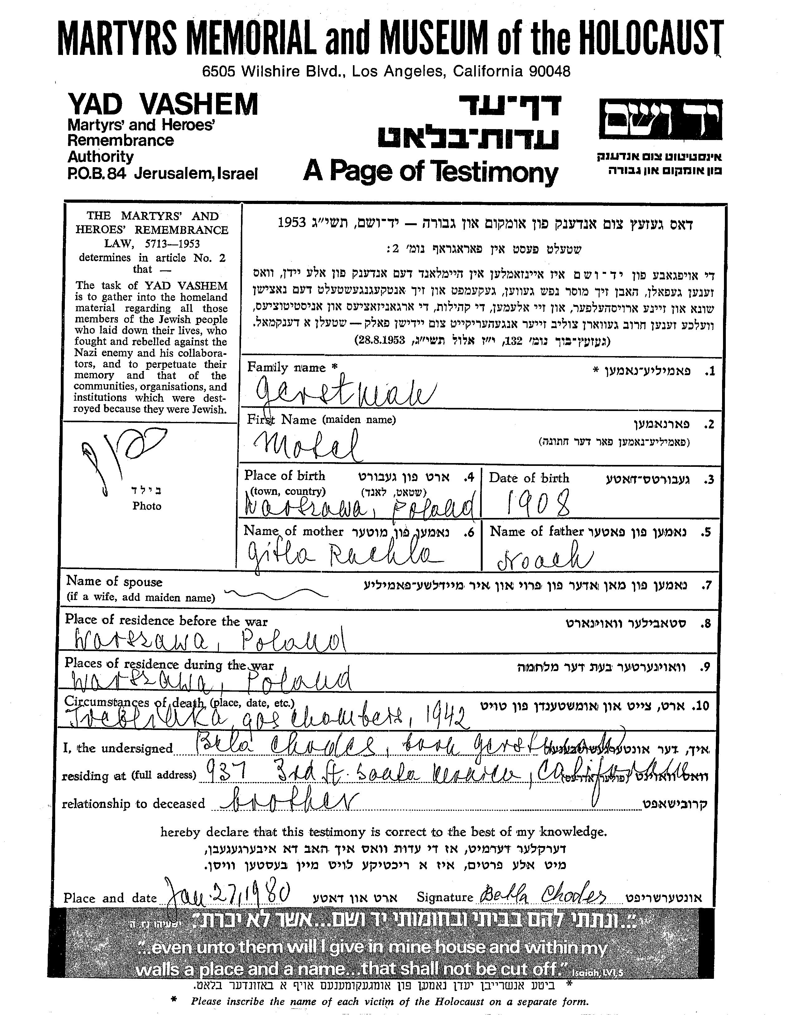 Motel Motek Gerstman wurde im Jahr 1908 geboren. Vor dem Zweiten Weltkrieg lebte er in Warszawa, Polen.