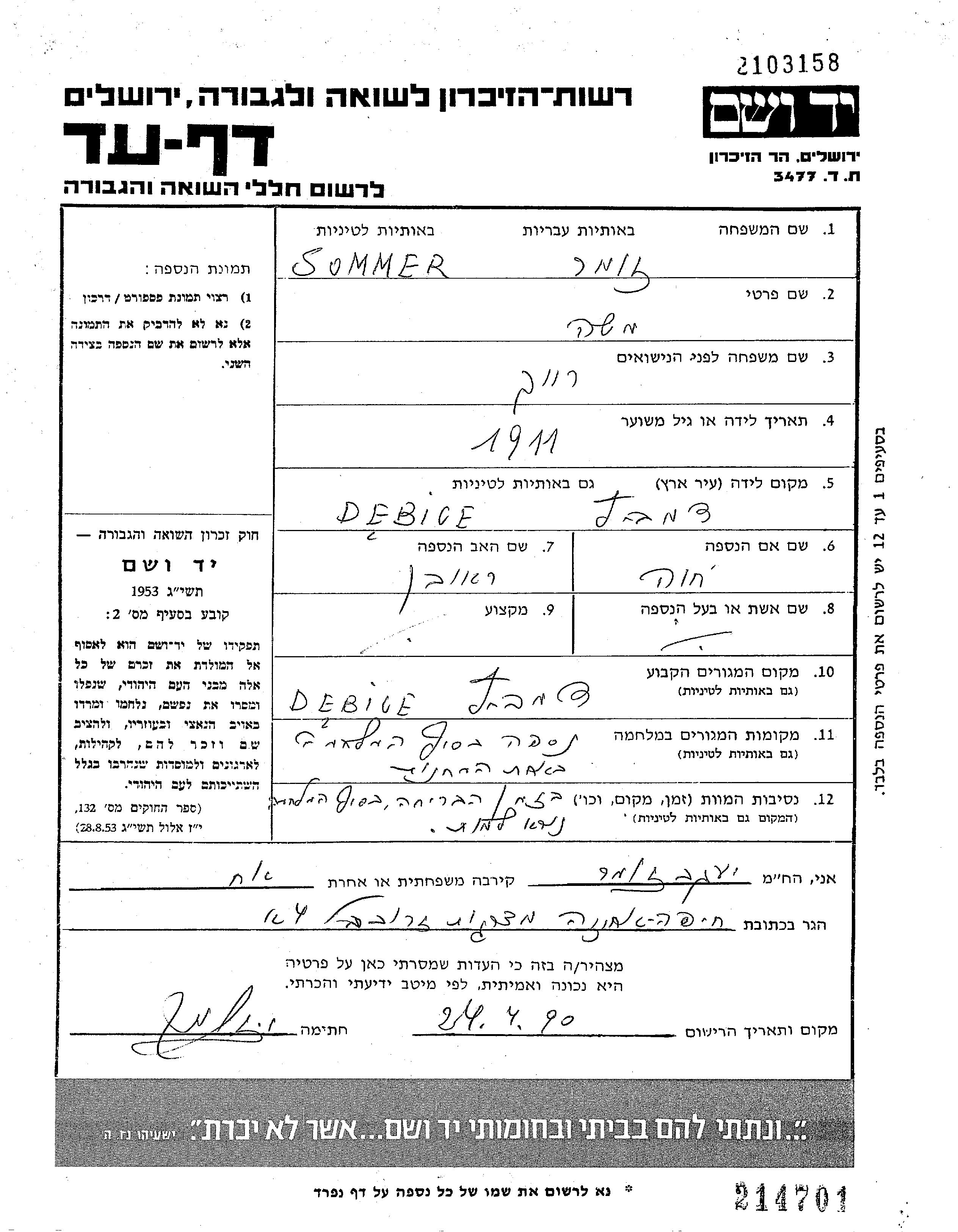 Sommer Moshe 1911 Debica, Polen Gedenkblatt