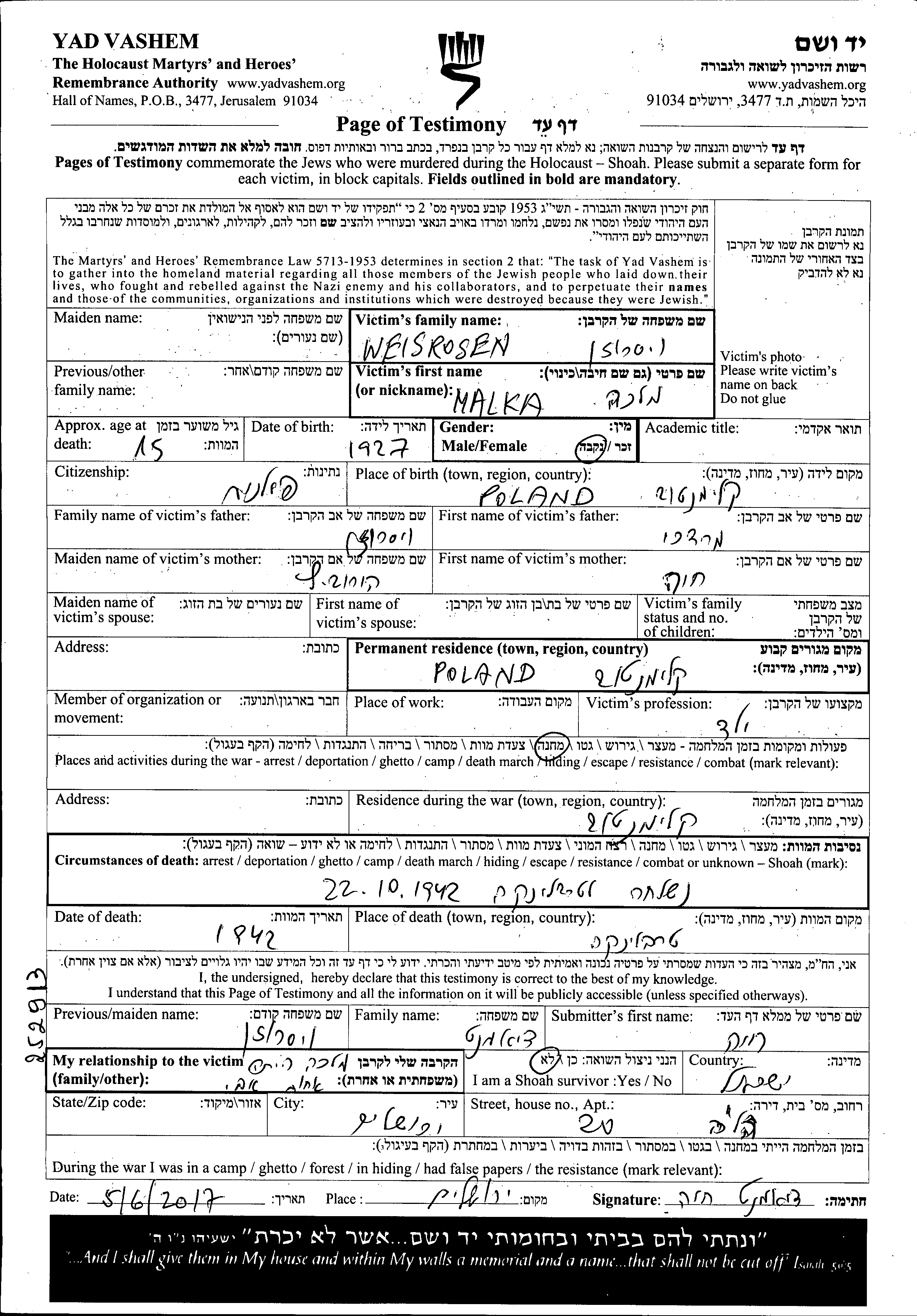 Malka Wajsrozen wurde im Jahr 1927 in Klimontow, Polen geboren. Vor dem Zweiten Weltkrieg lebte sie in Klimontow, Polen.