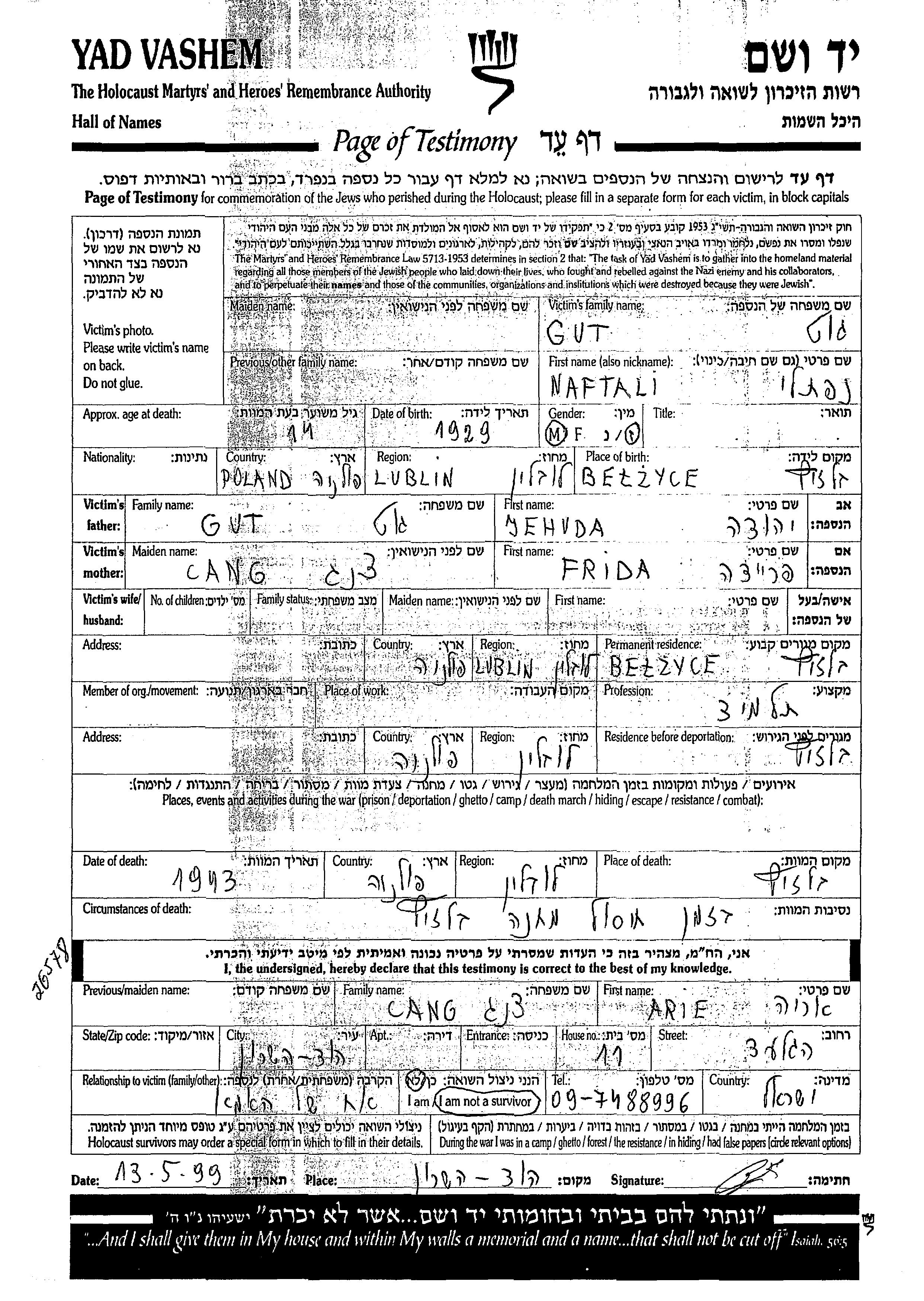 Naftali wurde in der Schoah ermordet. Todesort: Belzyce, Polen im Jahr 1943.