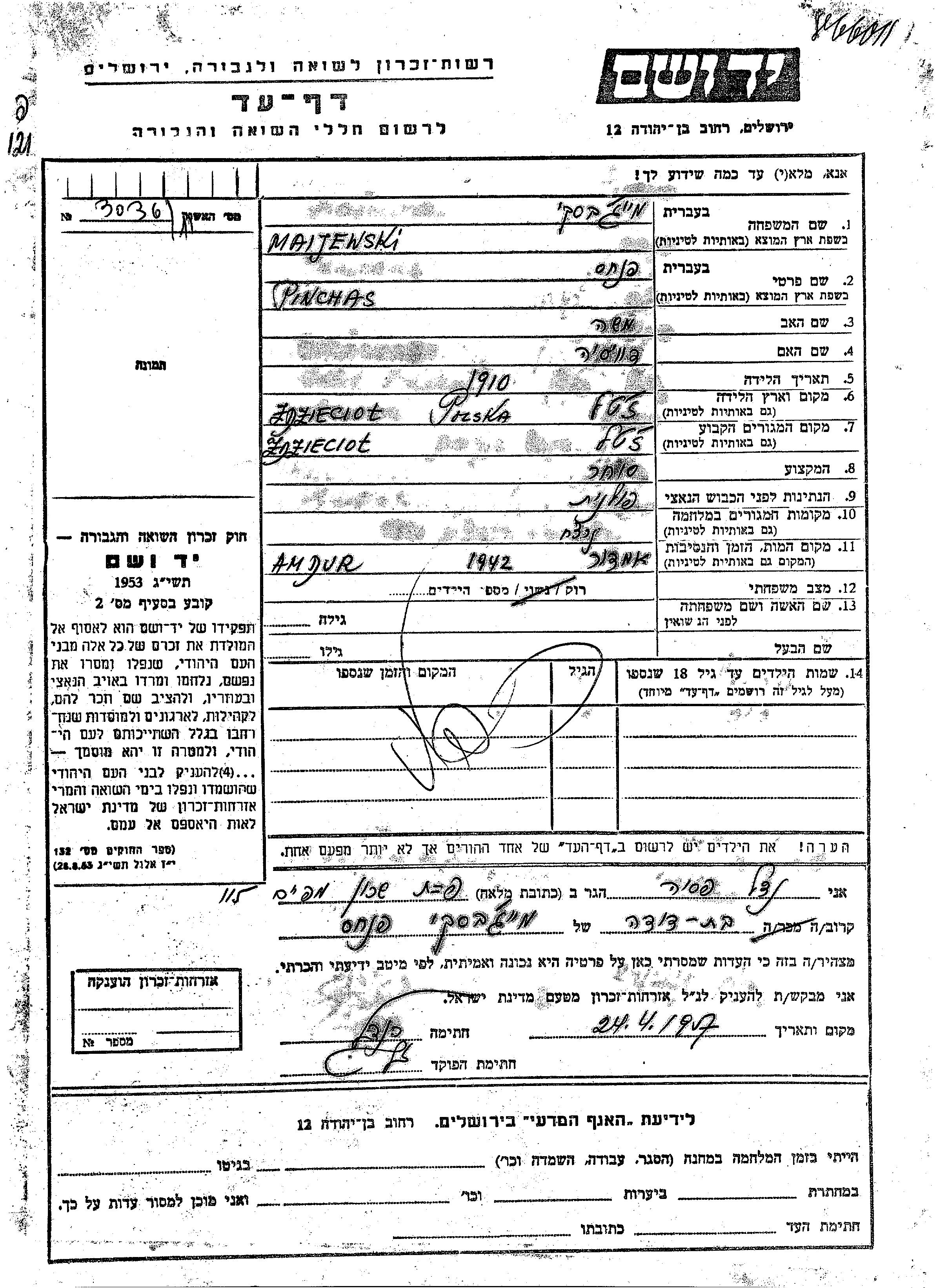 Pinkhas Mejewski wurde im Jahr 1910 geboren. Er war Kaufmann/-frau. Vor dem Zweiten Weltkrieg lebte er in Zdzieciol, Polen.