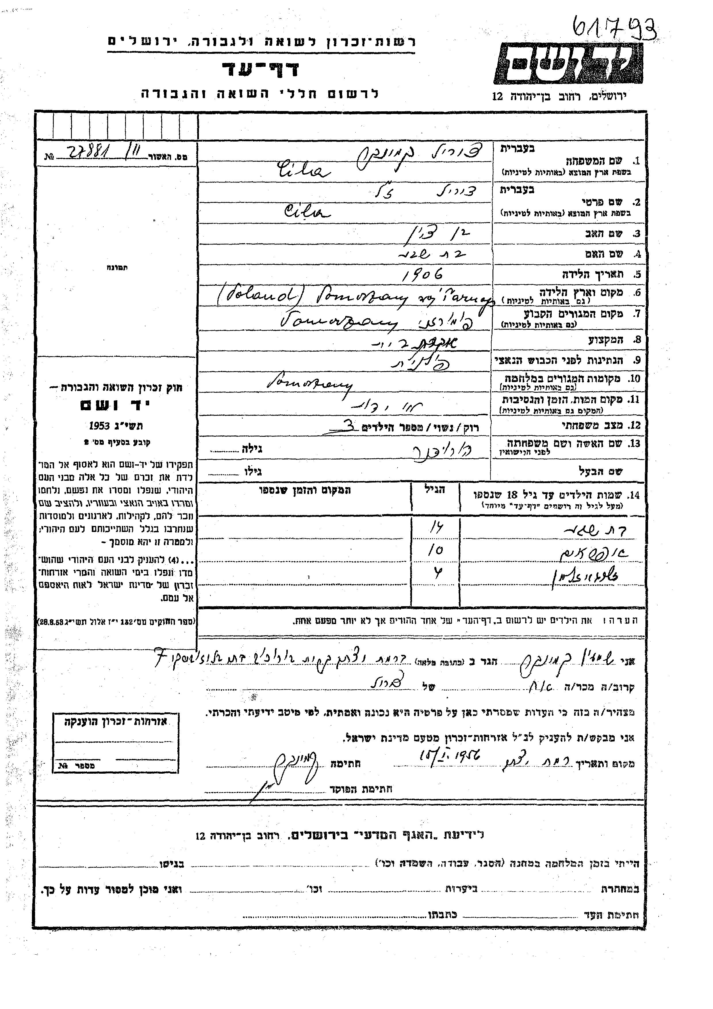Cila Tziril Horodner, geb. Kaminker wurde im Jahr 1906 in Pomorzany, Polen geboren. Sie war die Tochter von Bentzion und Batsheva. Sie war Hausfrau und Verheiratet. Vor dem Zweiten Weltkrieg lebte sie in Pomorzany, Polen. Während des Krieges war sie in Pomorzany, Polen.