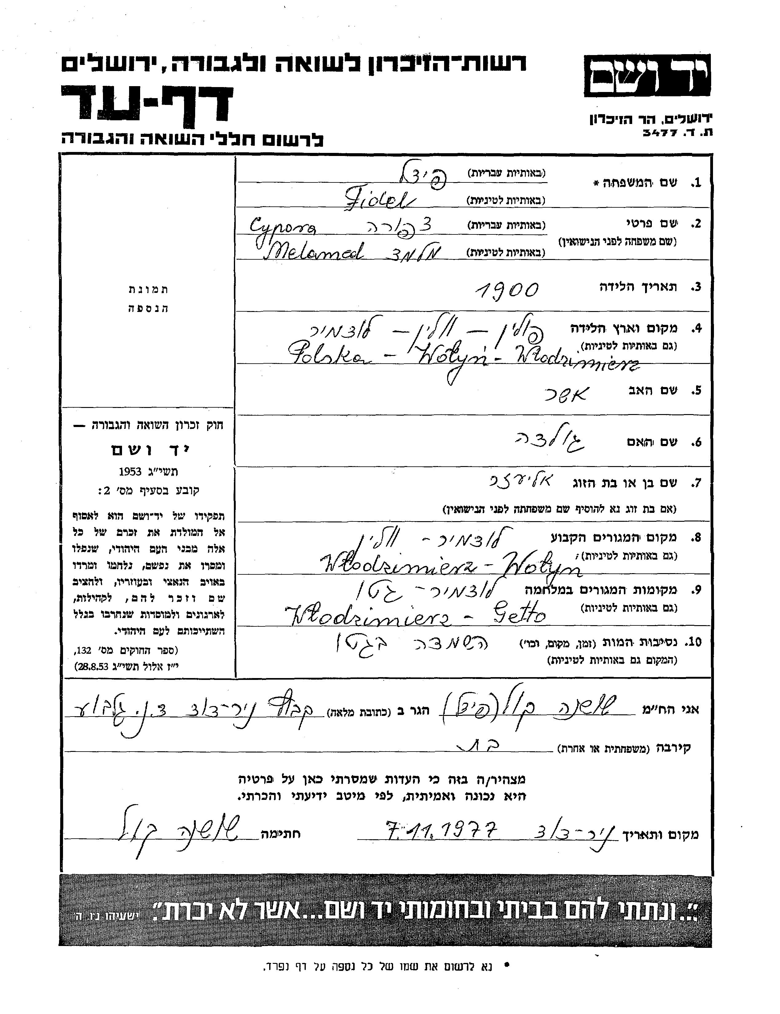 Tzipora Fidel, geb. Melamed wurde im Jahr 1900 geboren. Sie war Hausfrau. Vor dem Zweiten Weltkrieg lebte sie in Wlodzimierz, Polen.