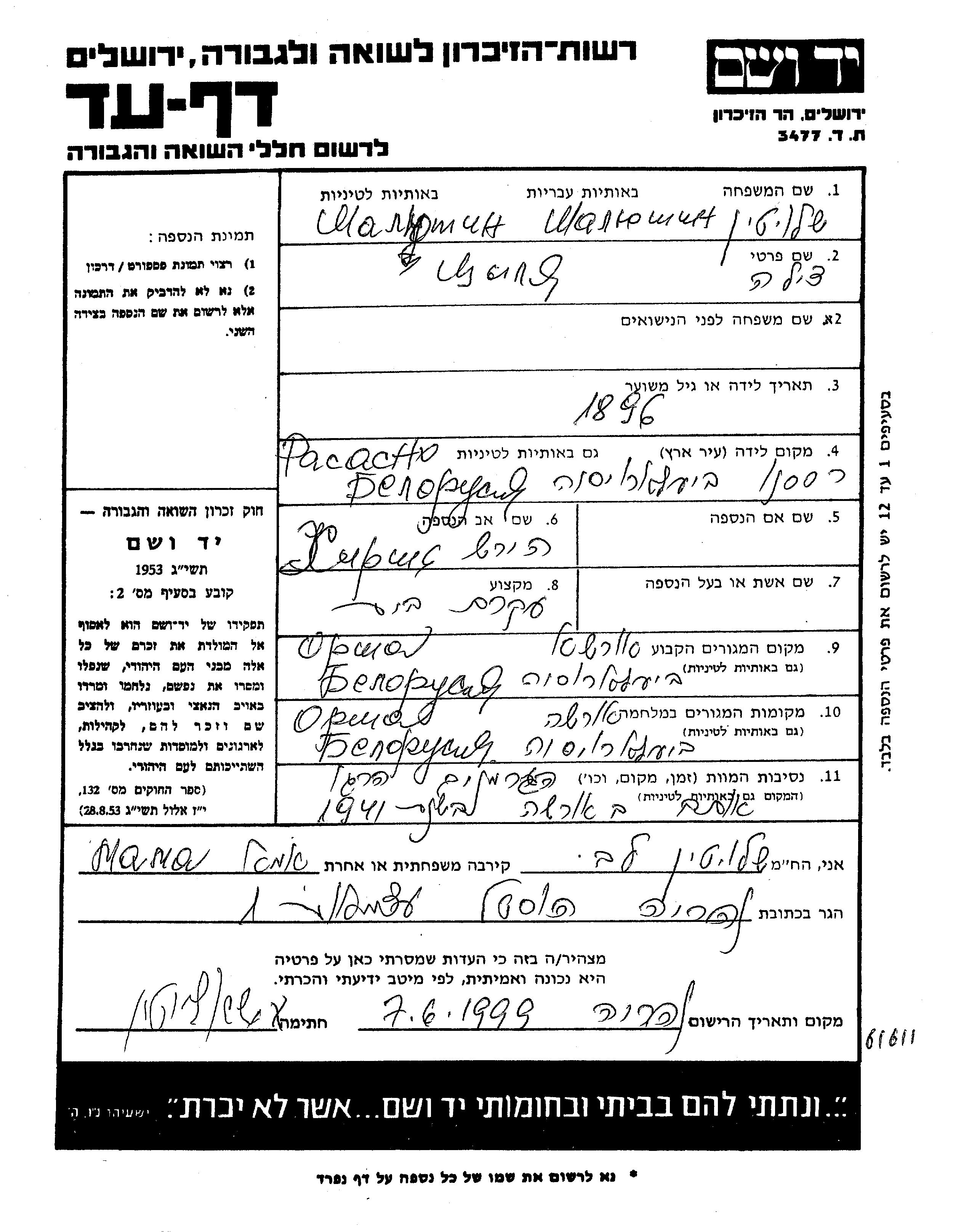 Tzila Shalyutin wurde im Jahr 1896 in Rosasno, Weißrussland (UdSSR) geboren. Sie war Hausfrau. Vor dem Zweiten Weltkrieg lebte sie in Orsha, Weißrussland (UdSSR). Tzila wurde in der Schoah ermordet. Todesort: Orsha, Weißrussland (UdSSR) im Jahr 1941.