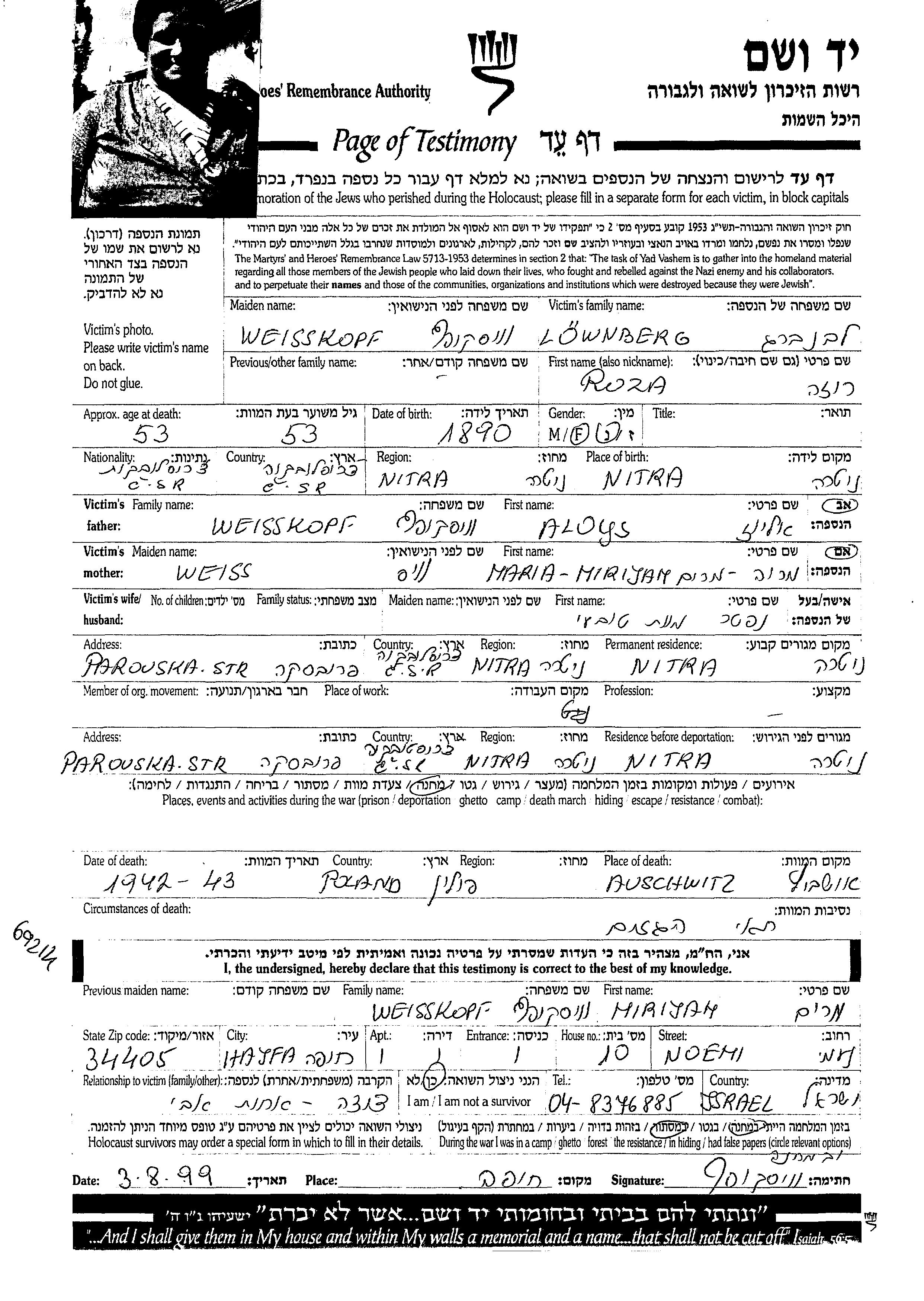 Roza wurde in der Schoah ermordet. Todesort: Auschwitz, Polen im Jahr 1942.
