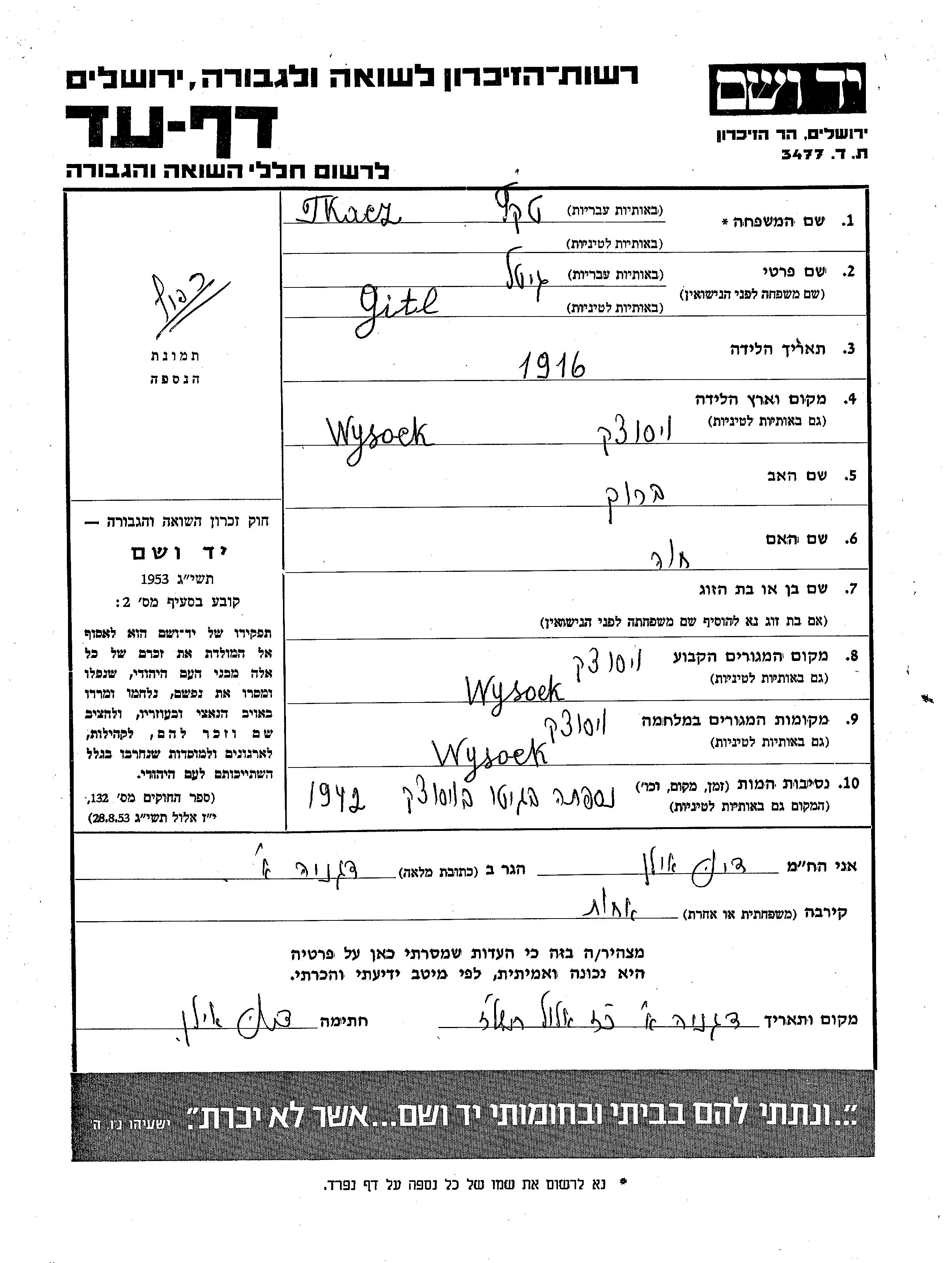 Tkacz | Gitl | 1916 | Wysock, Polen | Gedenkblatt |