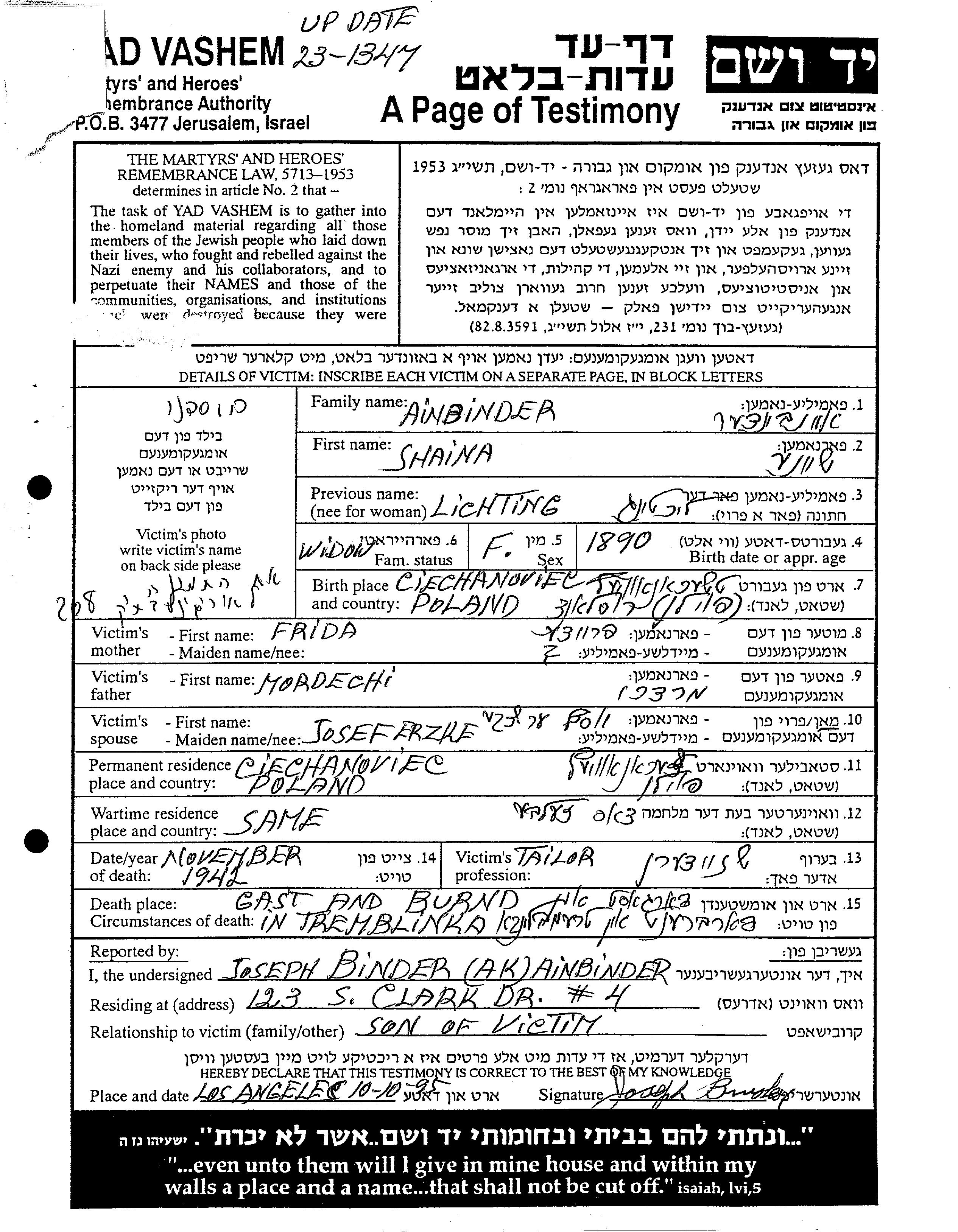 Shaine Ainbinder, geb. Lichting wurde im Jahr 1890 geboren. Vor dem Zweiten Weltkrieg lebte sie in Ciechanowiec, Polen.