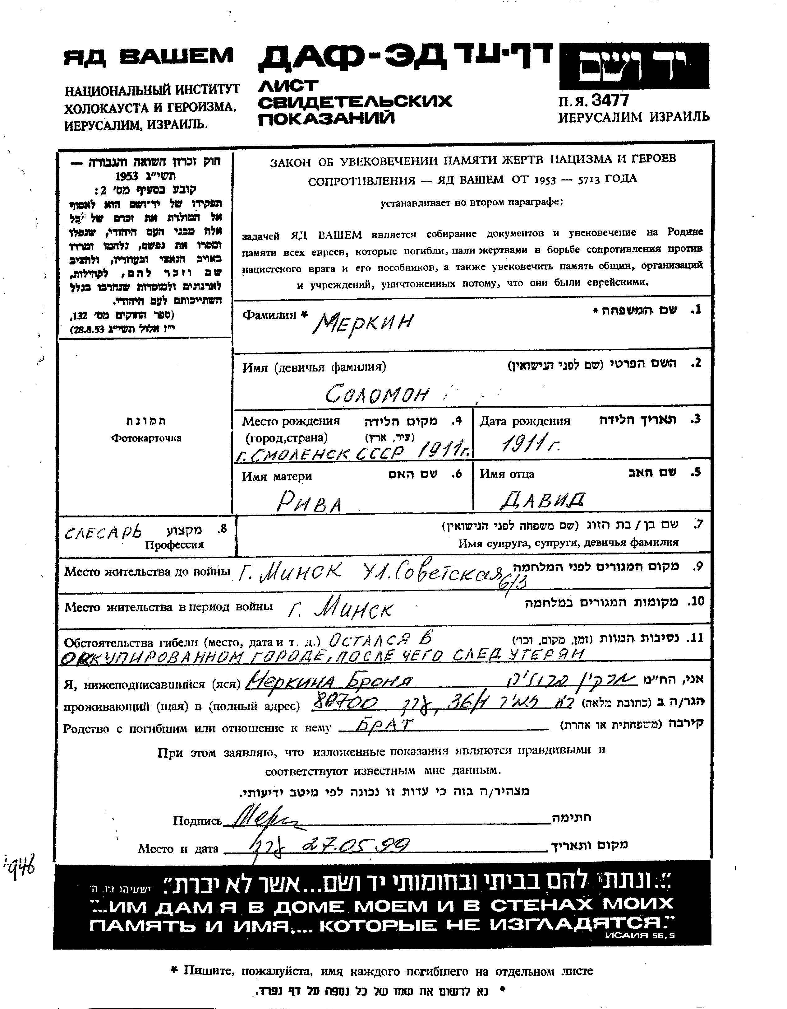 Solomon Markeninya wurde im Jahr 1911 in Smolensk, Russland (UdSSR) geboren. Er war Schlosser. Vor dem Zweiten Weltkrieg lebte er in Minsk, Weißrussland (UdSSR).