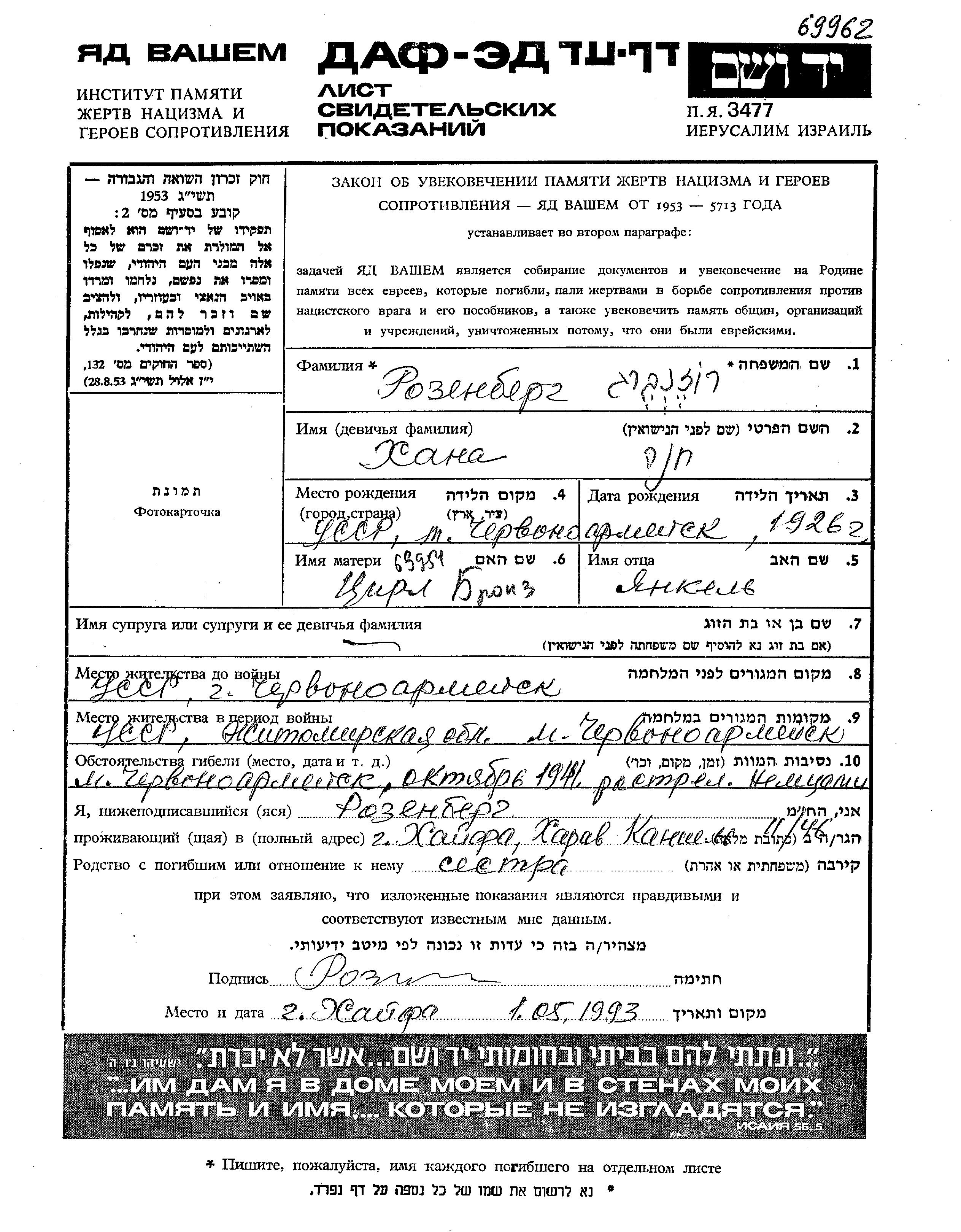Khana Rozenberg wurde im Jahr 1926 in Chervonoarmeysk, Ukraine (UdSSR) geboren. Sie war Schüler/-in. Vor dem Zweiten Weltkrieg lebte sie in Chervonoarmeysk, Ukraine (UdSSR).