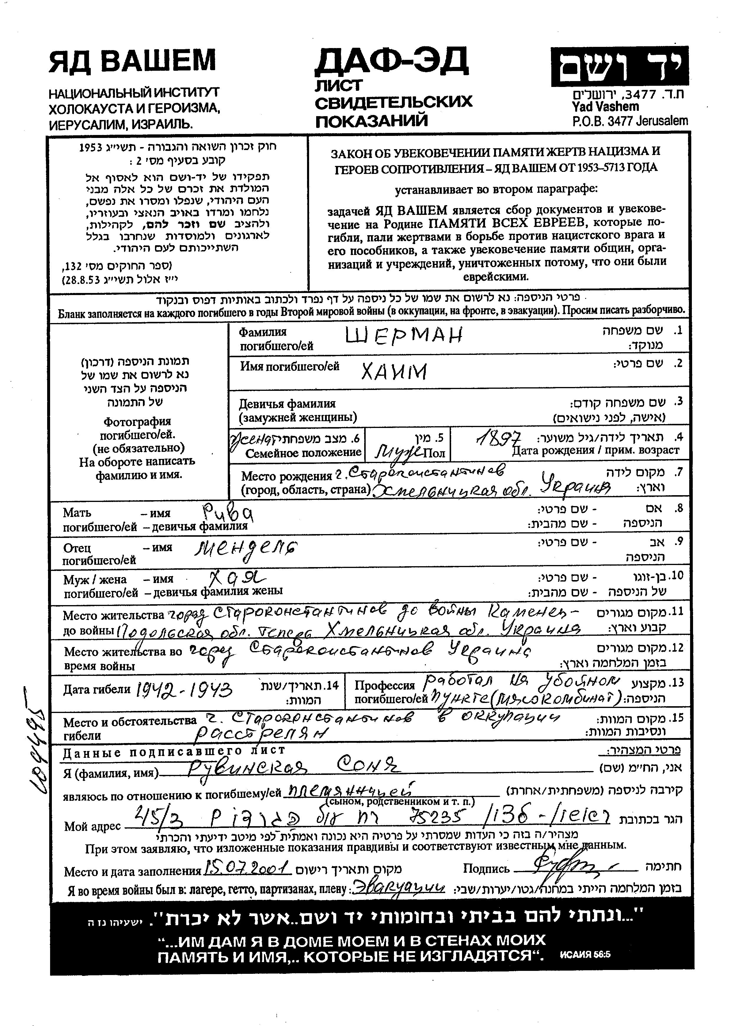 Khaim wurde in der Schoah ermordet. Todesort: Staro Konstantinov, Ukraine (UdSSR) im Jahr 1942.