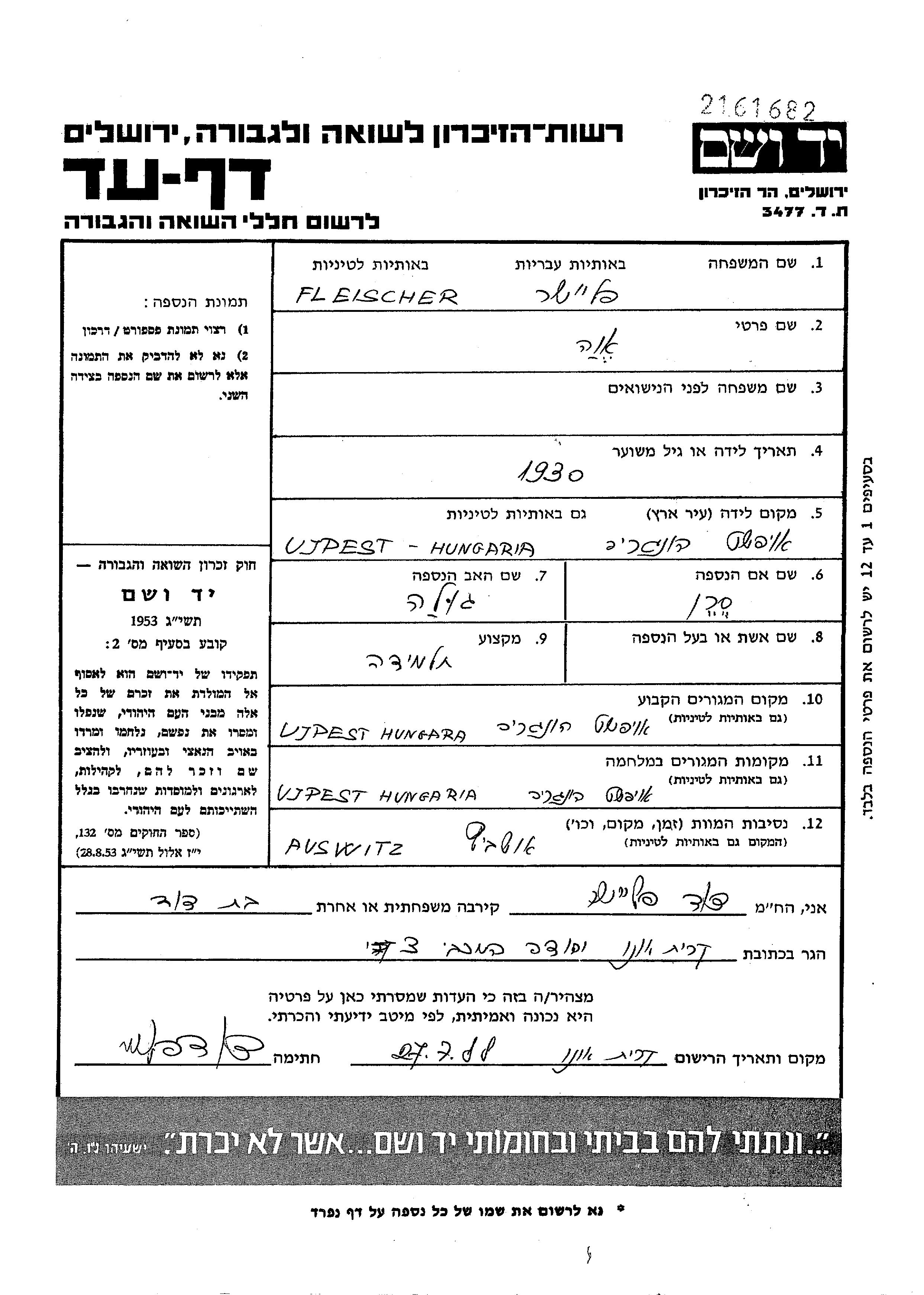 Eva Fleischer wurde im Jahr 1930 in Ujpest, Ungarn geboren. Sie war Schüler/-in. Vor dem Zweiten Weltkrieg lebte sie in Ujpest, Ungarn.