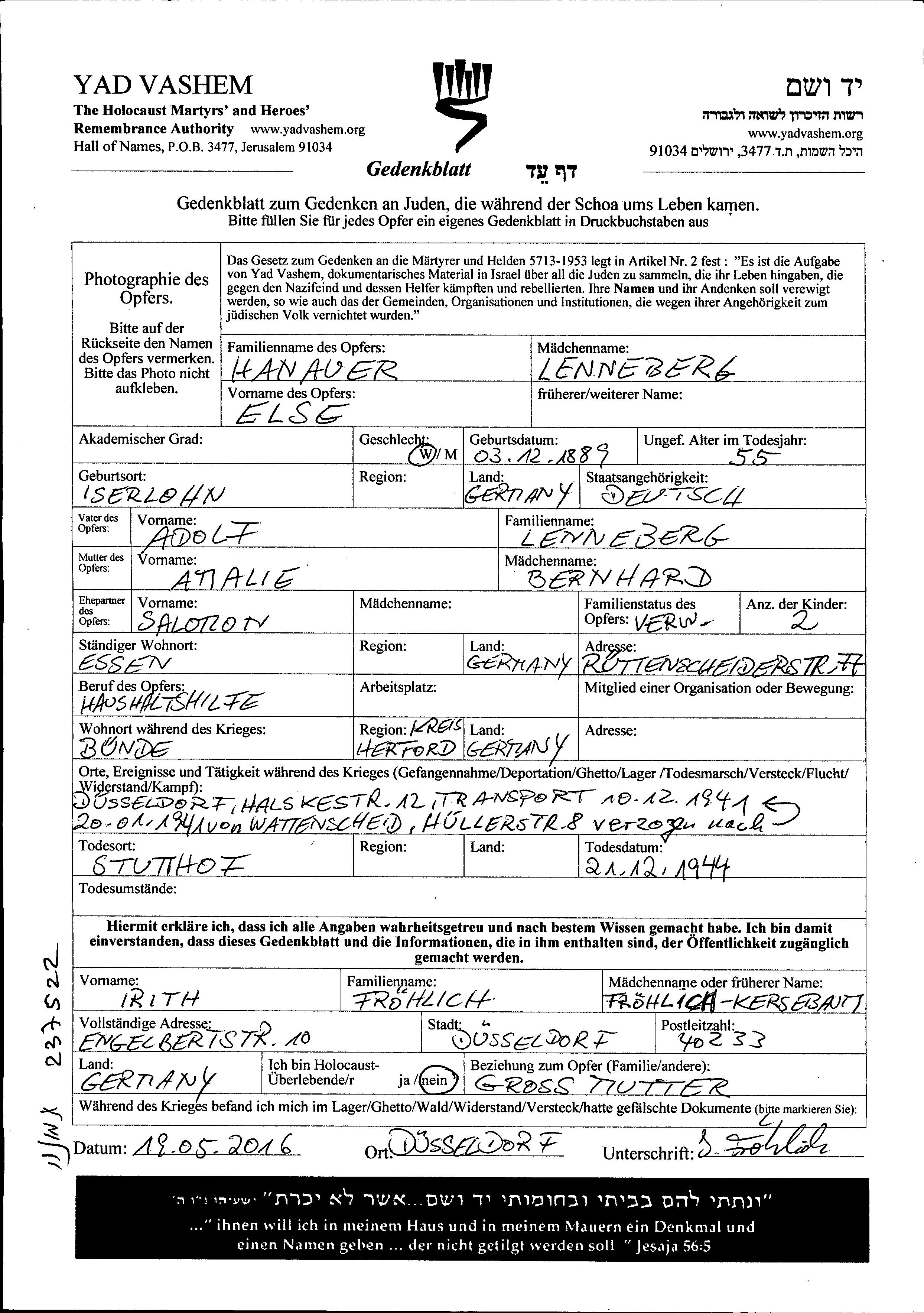 Hanauer Else 1889 Essen, Deutsches Reich Verfolgtenliste