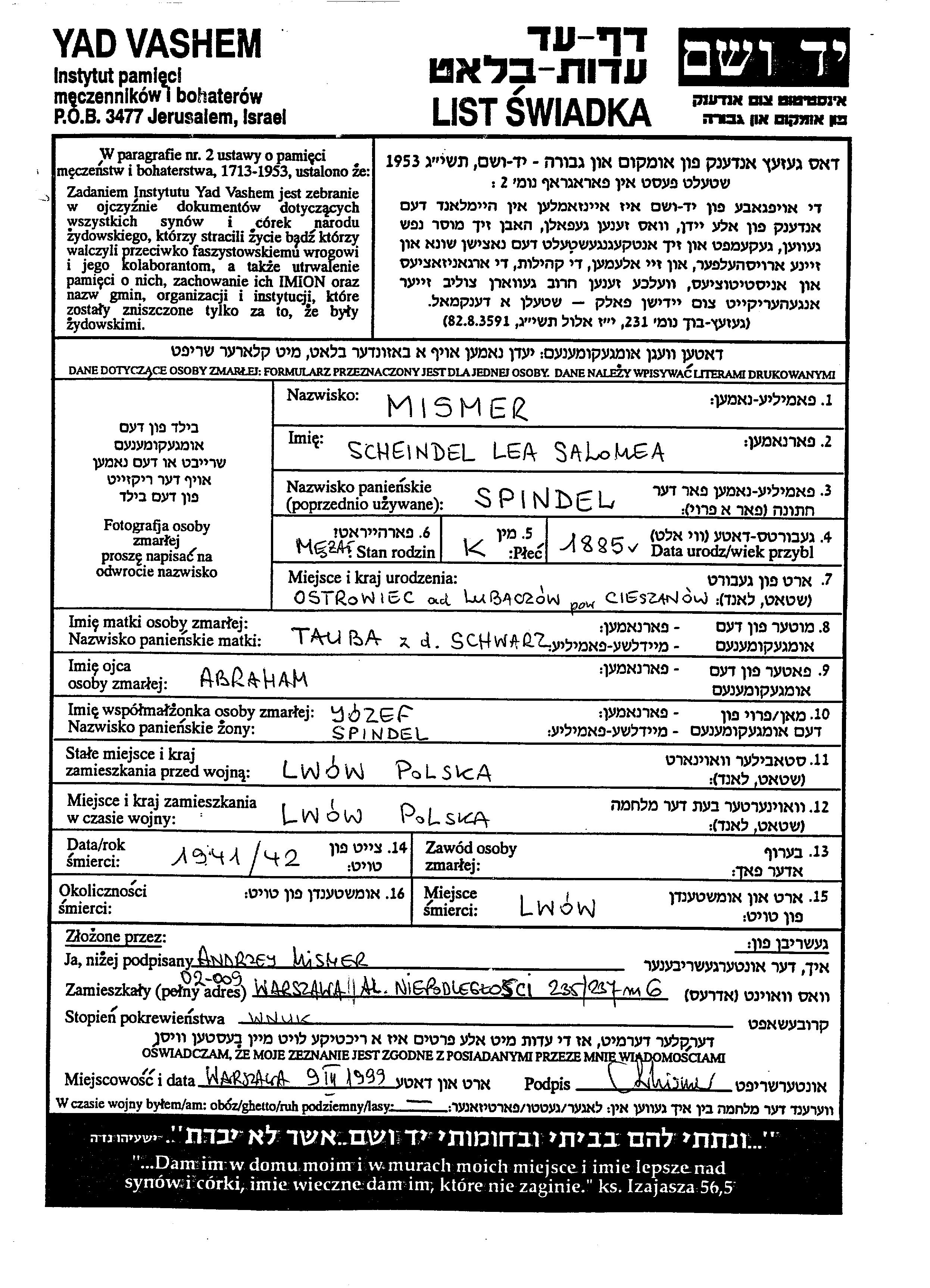 Scheindel Lea Salomea Spindel Mismer, geb. Mismer Spindel wurde im Jahr 1885 in Ostrowiec, Polen geboren. Vor dem Zweiten Weltkrieg lebte sie in Lwow, Polen.