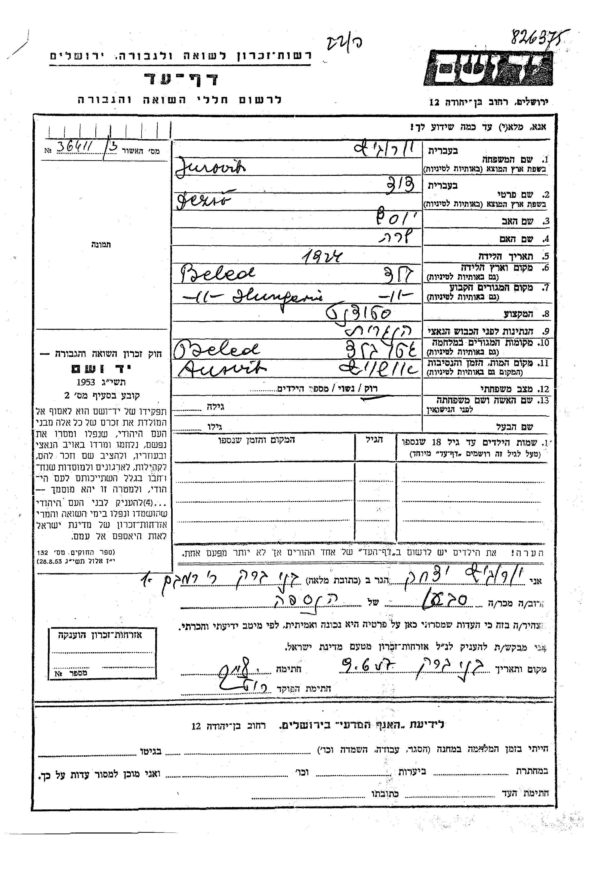 Jurovits Deziu David 1924 Beled, Ungarn Gedenkblatt